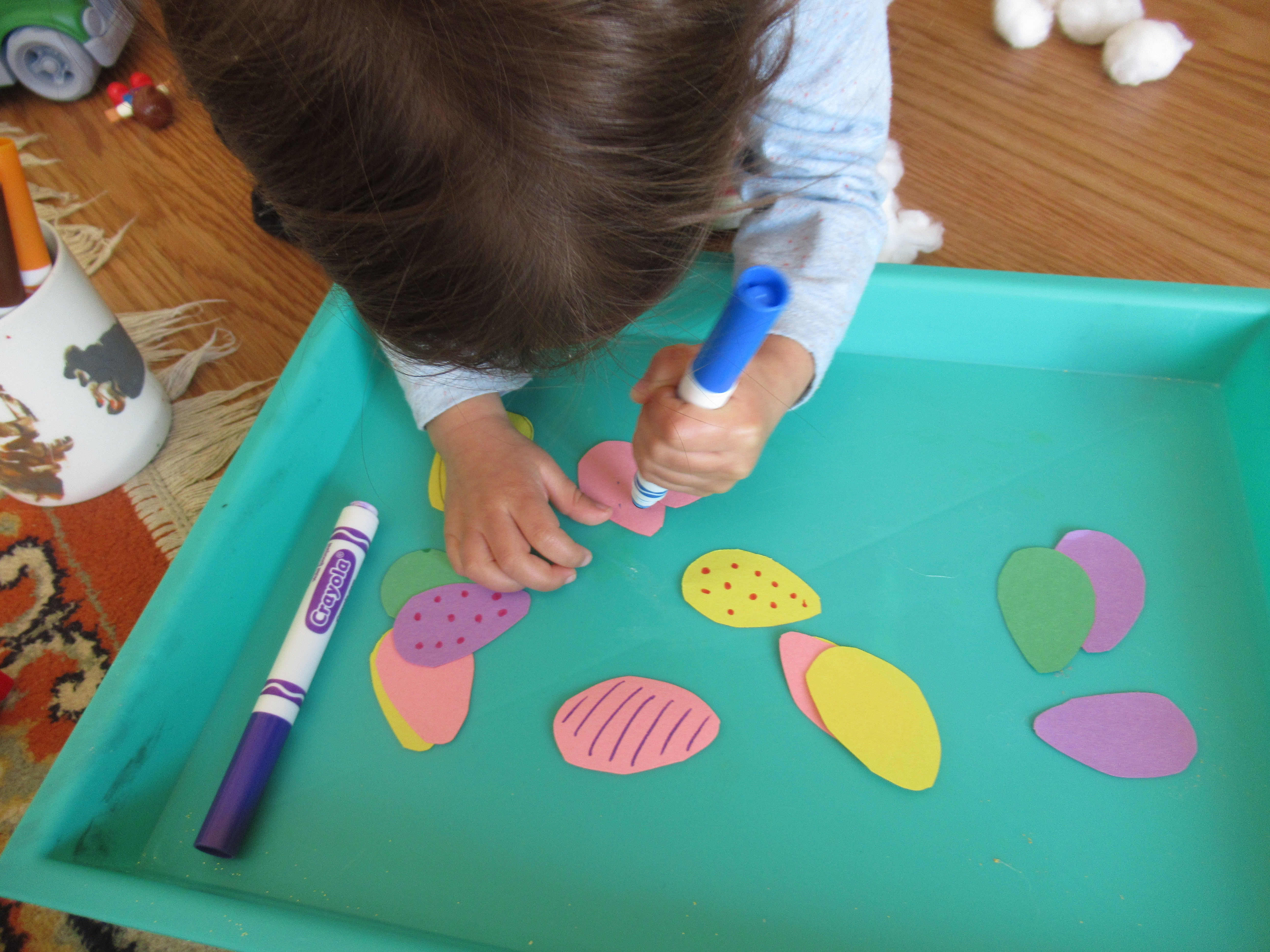 To start, we needed to decorate the “beads”, in this case Easter egg shapes cut from construction paper. I chose a few different springtime shades like purple, green, and pink. She loved decorating with markers, telling me very specifically which ones needed dots, lines, or sometimes silly drawings like “slippers”, and took her work quite seriously!