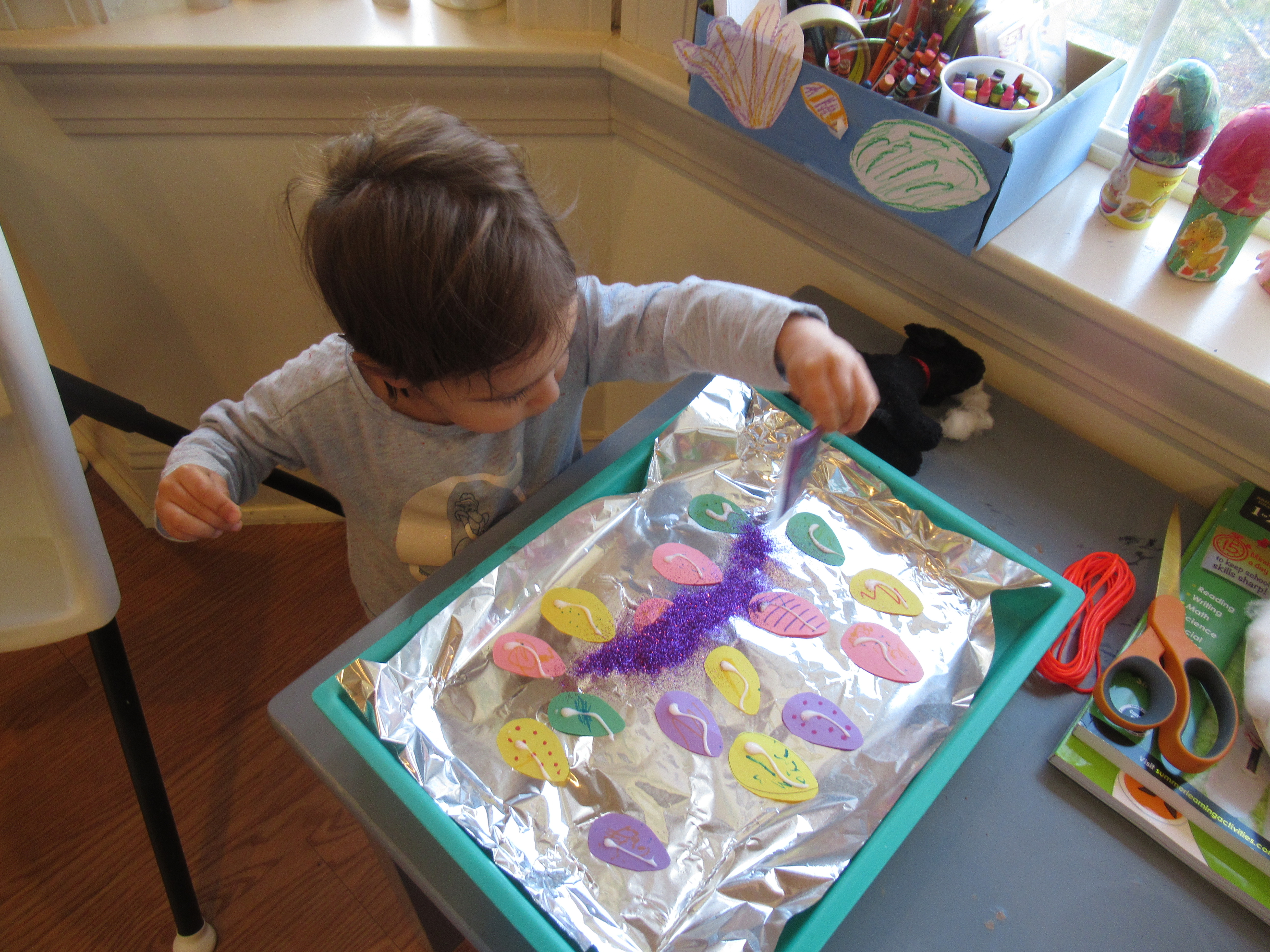 Of course there’s no need to stop at markers. Use crayons, add stickers or sequins, or embellish with whatever else is in your craft bin. To add some sparkle to her jewelry, we squirted a little glue onto each egg and sprinkled with purple glitter. This made the craft significantly more messy, but this girl loves glitter these days.
