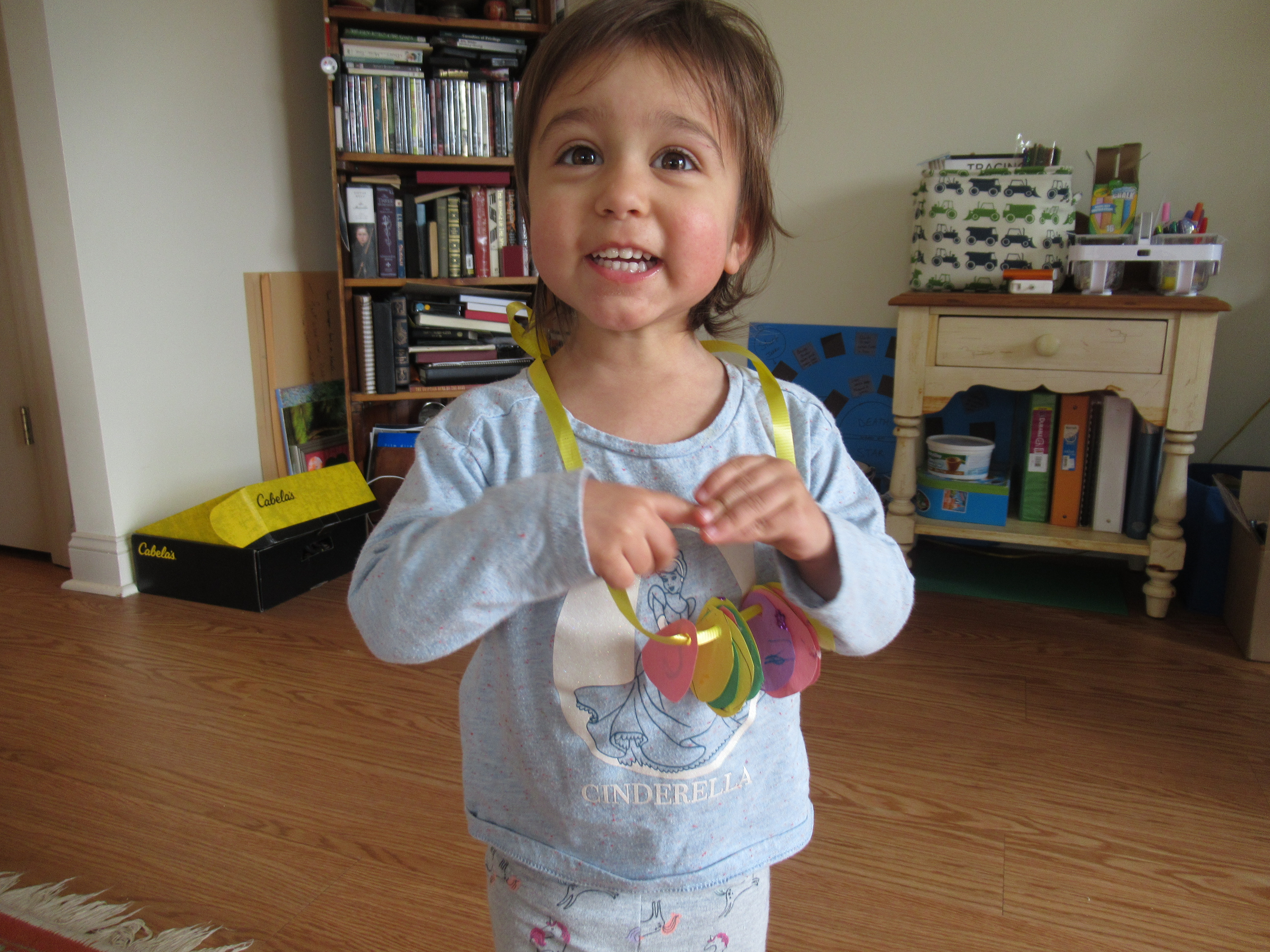 For some fine motor skills, encourage your child to thread the egg “beads” ribbon to finish the necklace. I punched a hole near the top of each egg, and gave Veronika a yellow ribbon. (Note: You can wrap a bit of tape around the end of a ribbon to make it more like the aglet of a shoelace, for easier threading).
