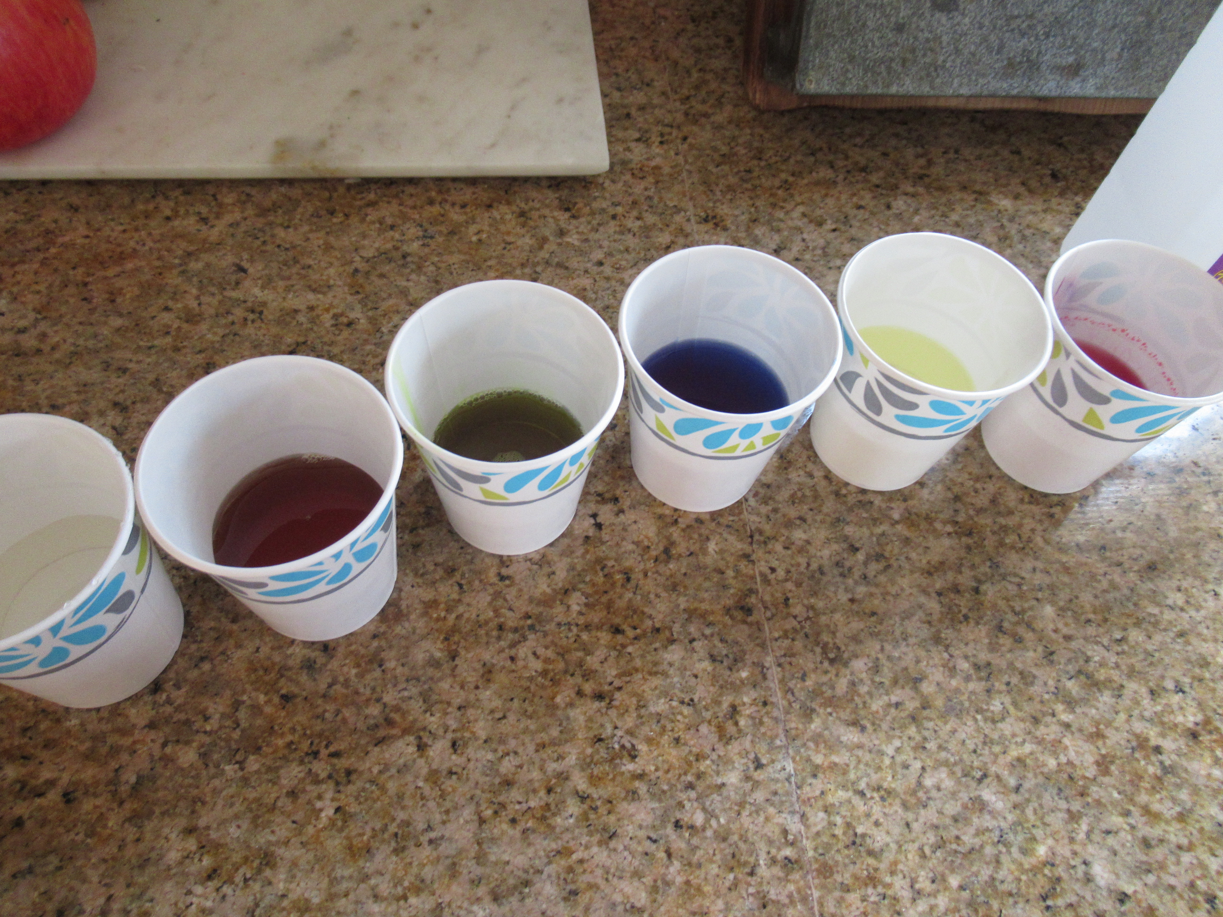 A few of the liquids were left their natural color but for those that would otherwise be confusingly clear, we added a little all-natural food coloring.