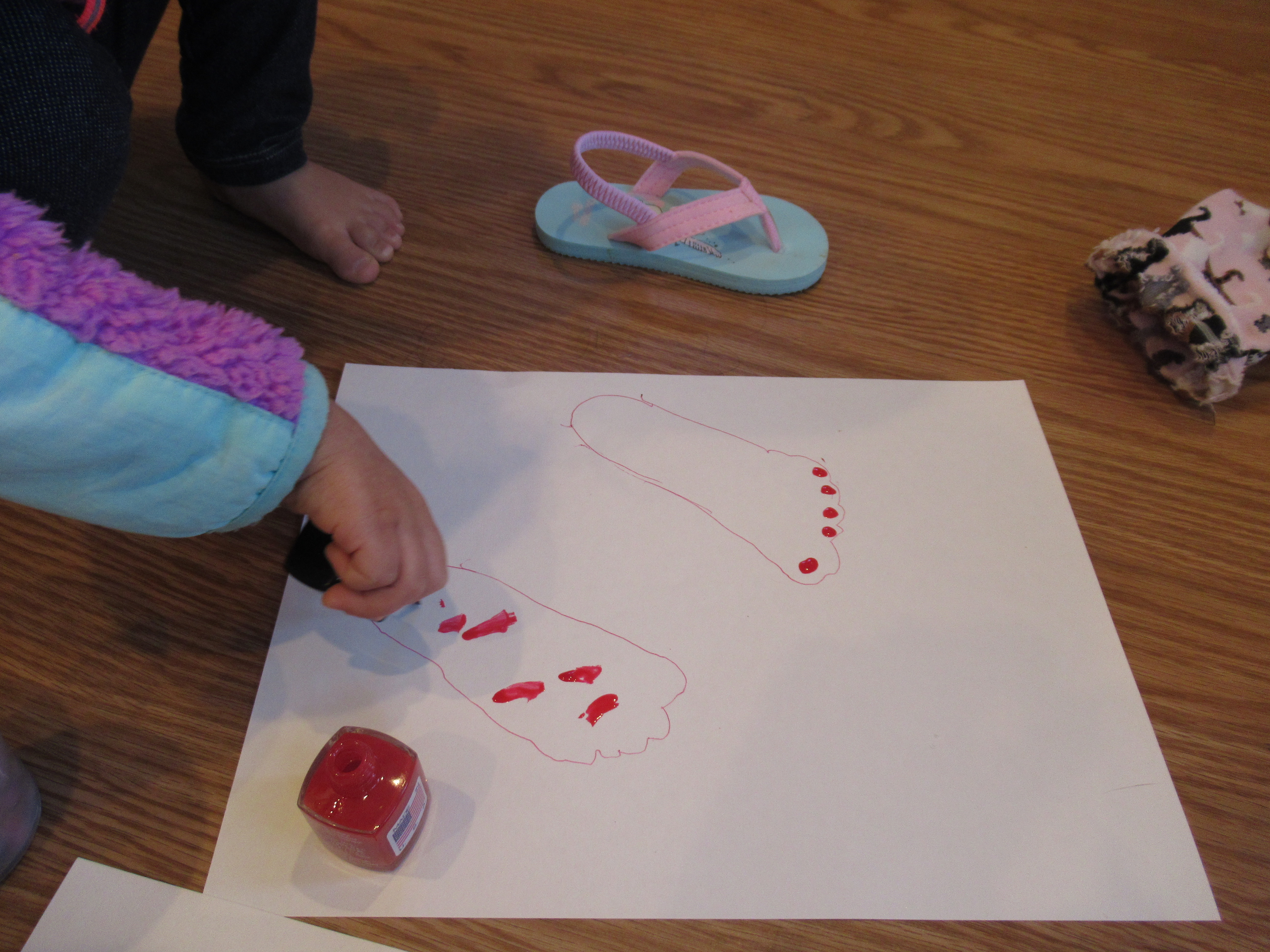 Toddlers can fill in the tracings with crayons and markers, but for something extra fun, I trotted out a vial of real nail polish. I showed her how to dab this into each toe like she was painting a little nail on each.