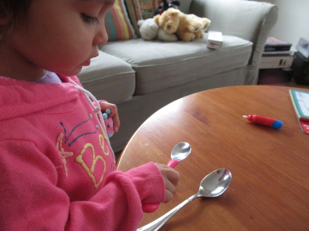 First, we played a classic game of Large and Small. I gave her a set of objects from around the house, with one item big and one smaller, including: spoons, crayons, socks, and toy bunnies.