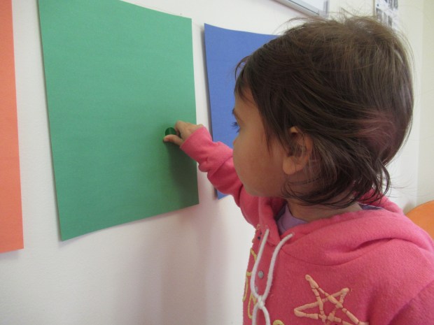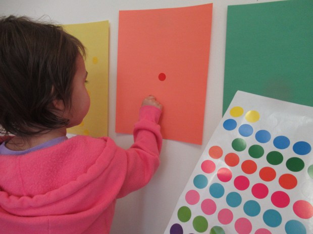 This time, I taped up sheets of colored construction paper to the wall that matched a set of dot label stickers. She simply had to decide where each sticker should go.