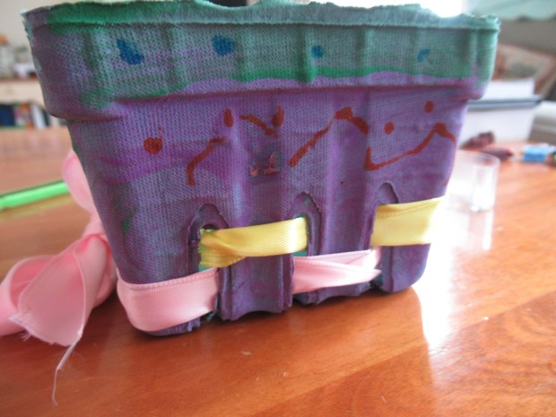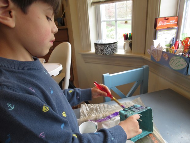 To start, you’ll need a cardboard berry basket, which meant this activity began with a trip to the farm stand to pick out fresh tomatoes and strawberries! After a little snack, the crafting began. Travis chose green and purple paint, which didn’t actually show up that well, but he gave it a proud coating and we left it to dry overnight.