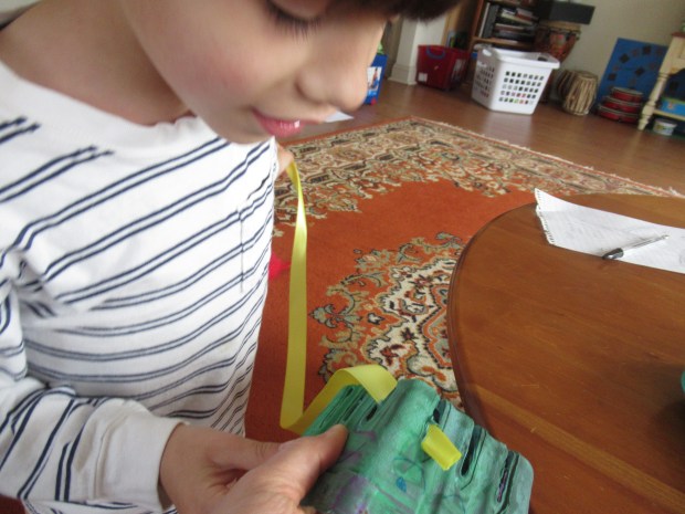 In the morning, he added decorations with marker. Next up was weaving! We used yellow and pink ribbon, and he worked diligently at poking the ribbon through each hole and pulling through.