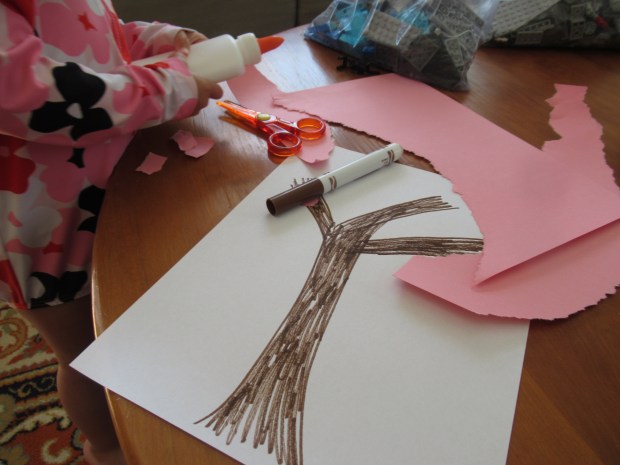 Next, Veronika helped tear pieces of pink construction paper to the flower blossoms. You can encourage preschoolers to cut these out with safety scissors, too!