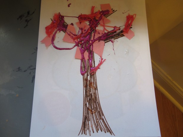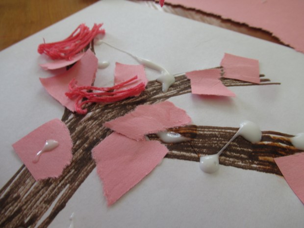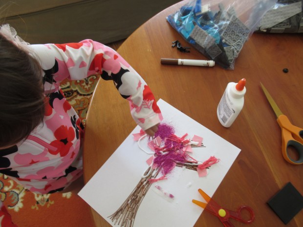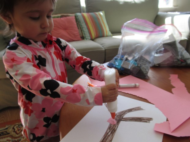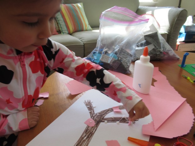 She loved being in charge of the glue for the next step; everywhere she dotted down, we placed a pink “flower”.