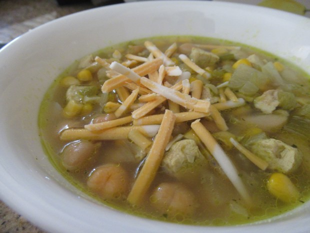 - Add the corn, cannellini beans, chickpeas, chiles, chick’n, and broth. Continue to simmer for 20 minutes.