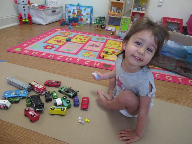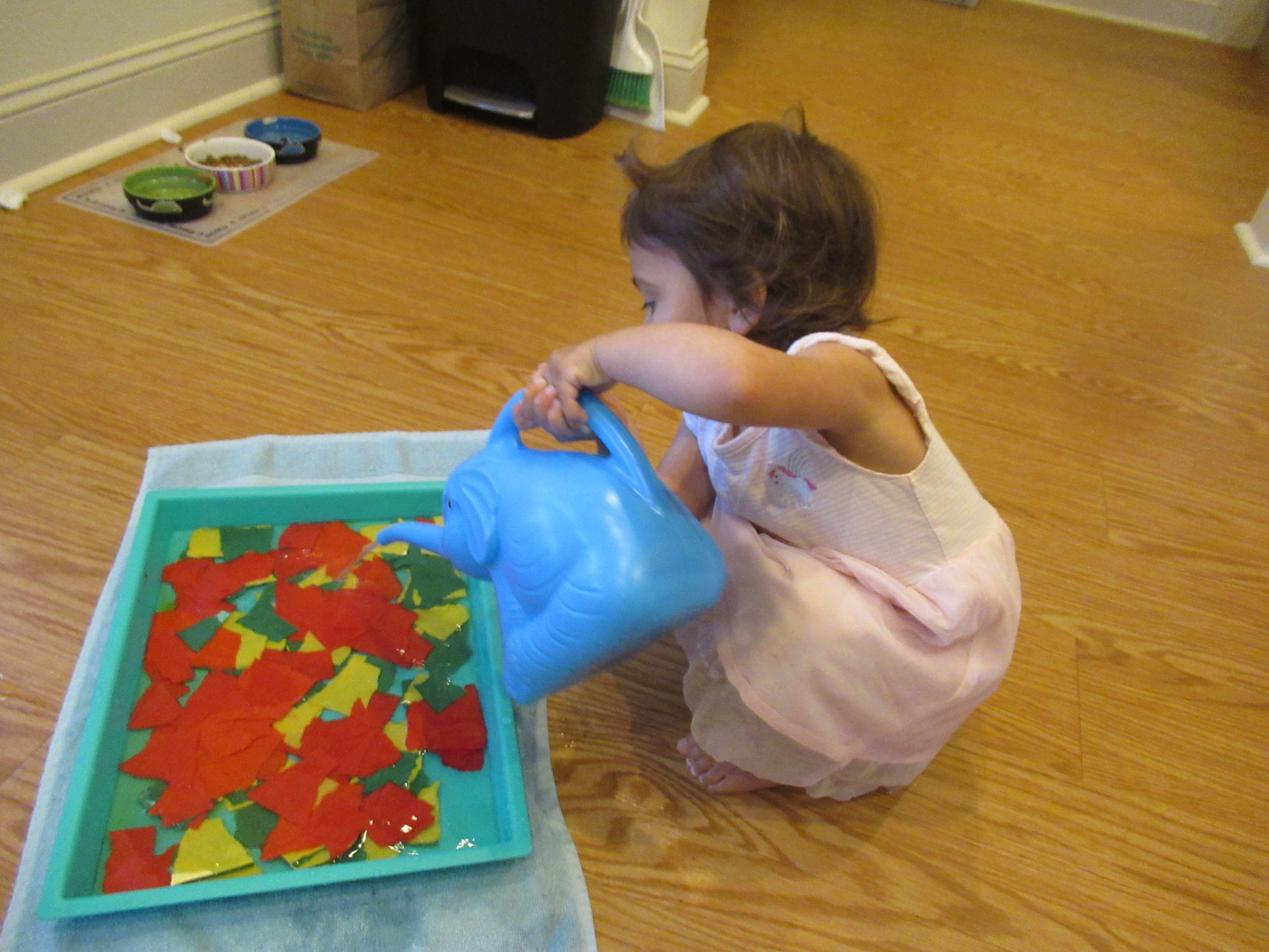 To start, Veronika helped tear up sheets of colored construction paper. Even better was pouring water from the watering can over the pieces until covered. Let soak for at least a few hours.