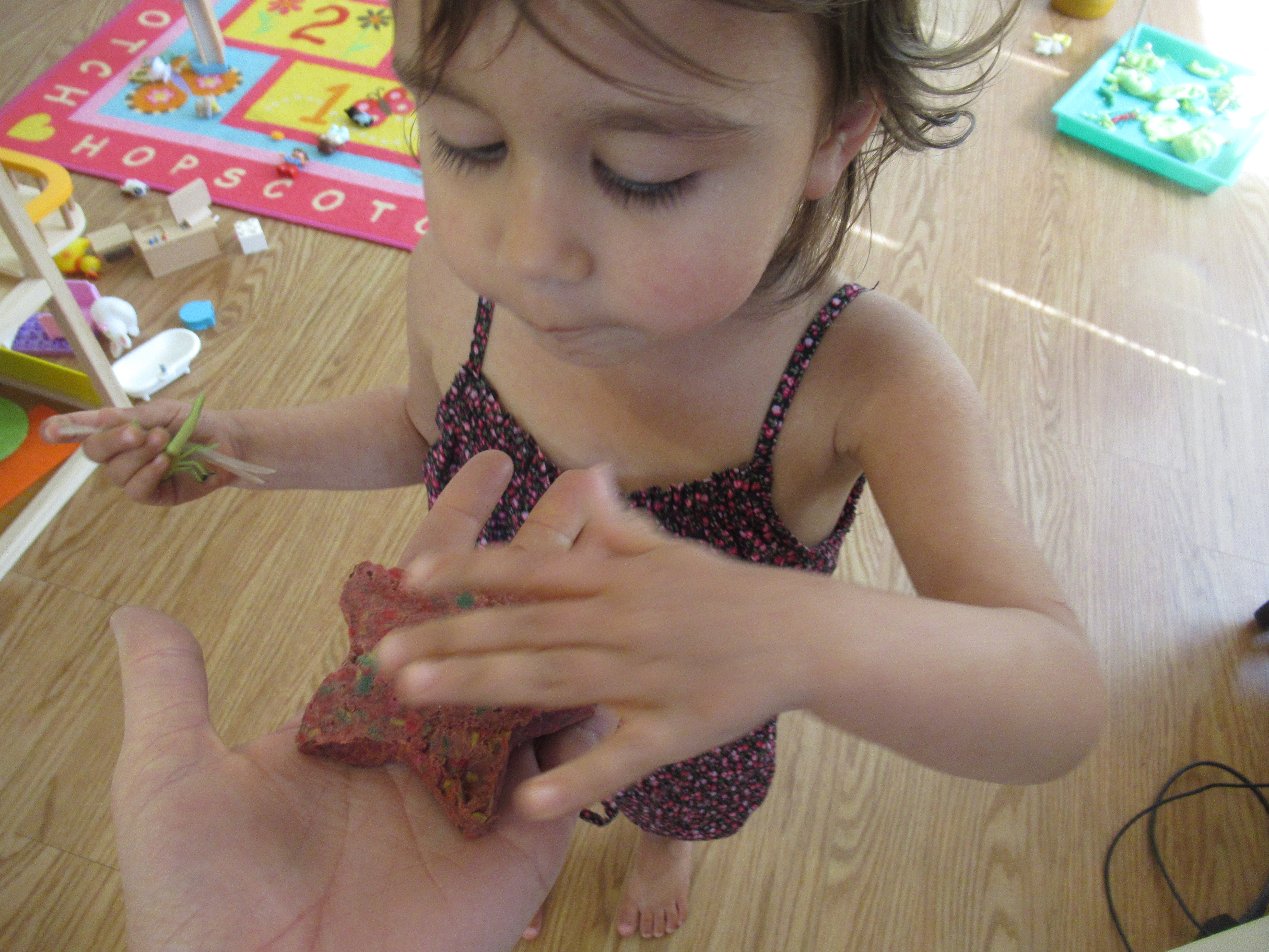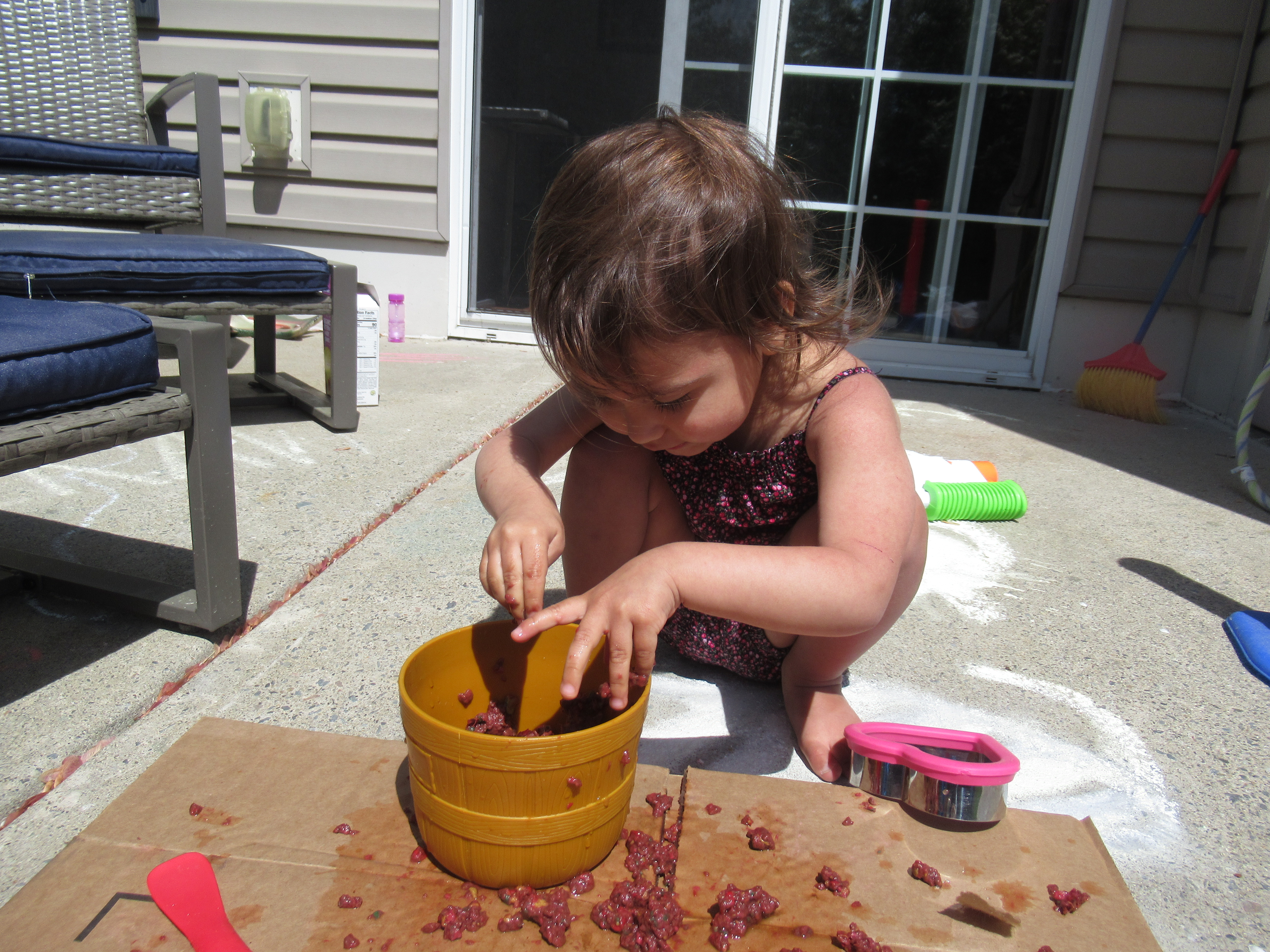 “I did it with my hands!” she said, and that’s exactly what she did for the next half hour. She picked up the paper pulp, squihsed it, filled the bucket, dumped it, and began all over again.