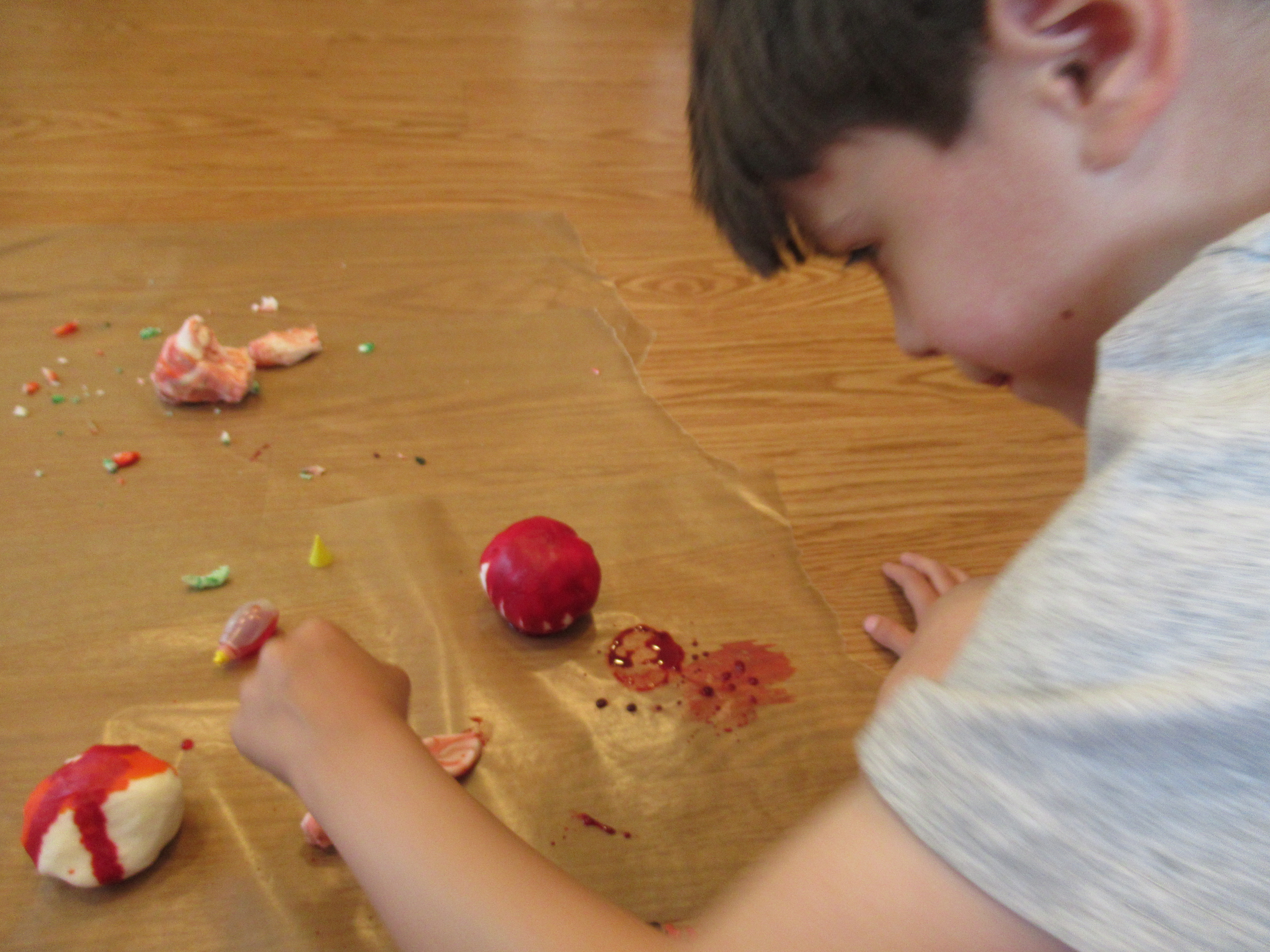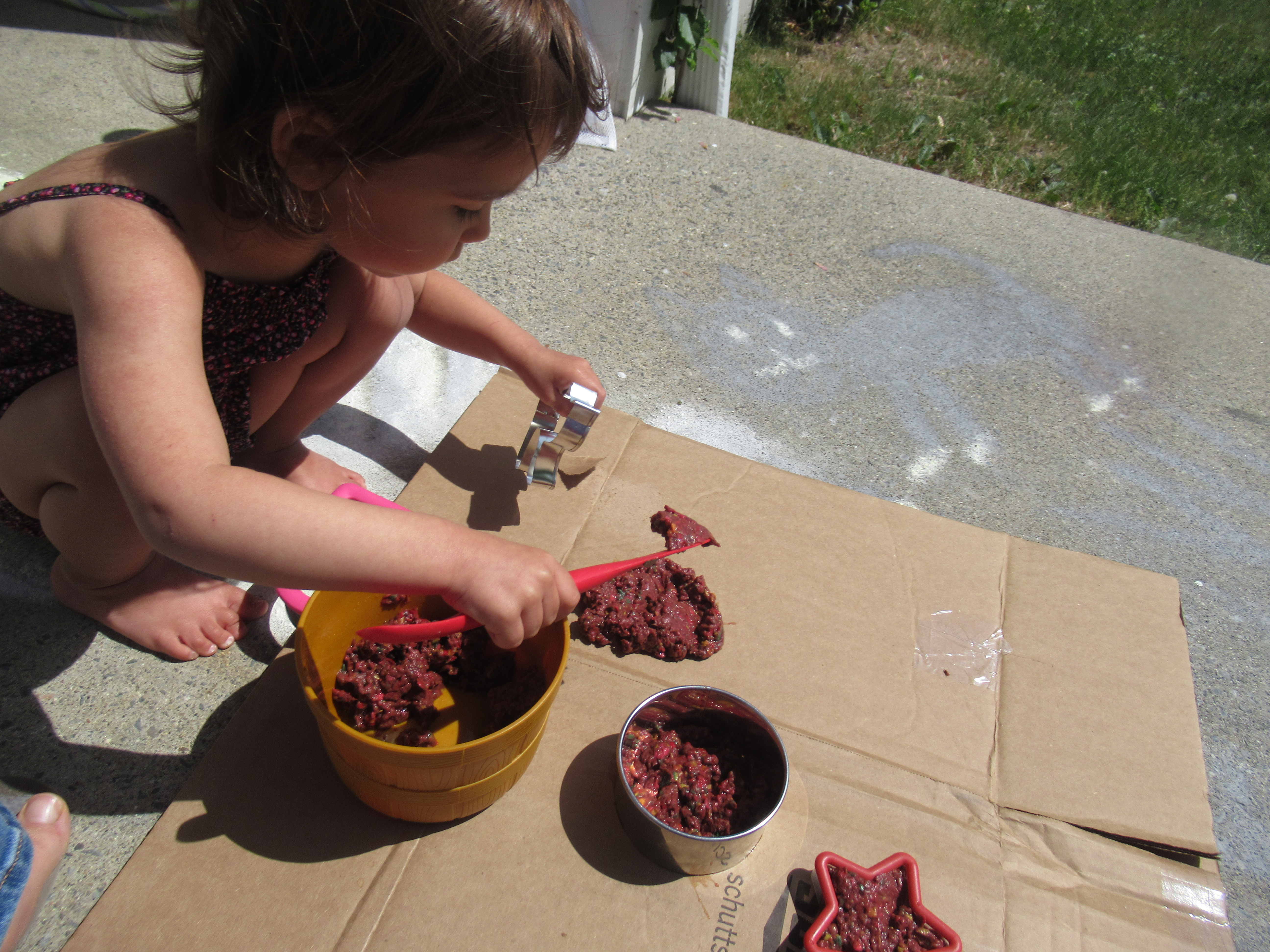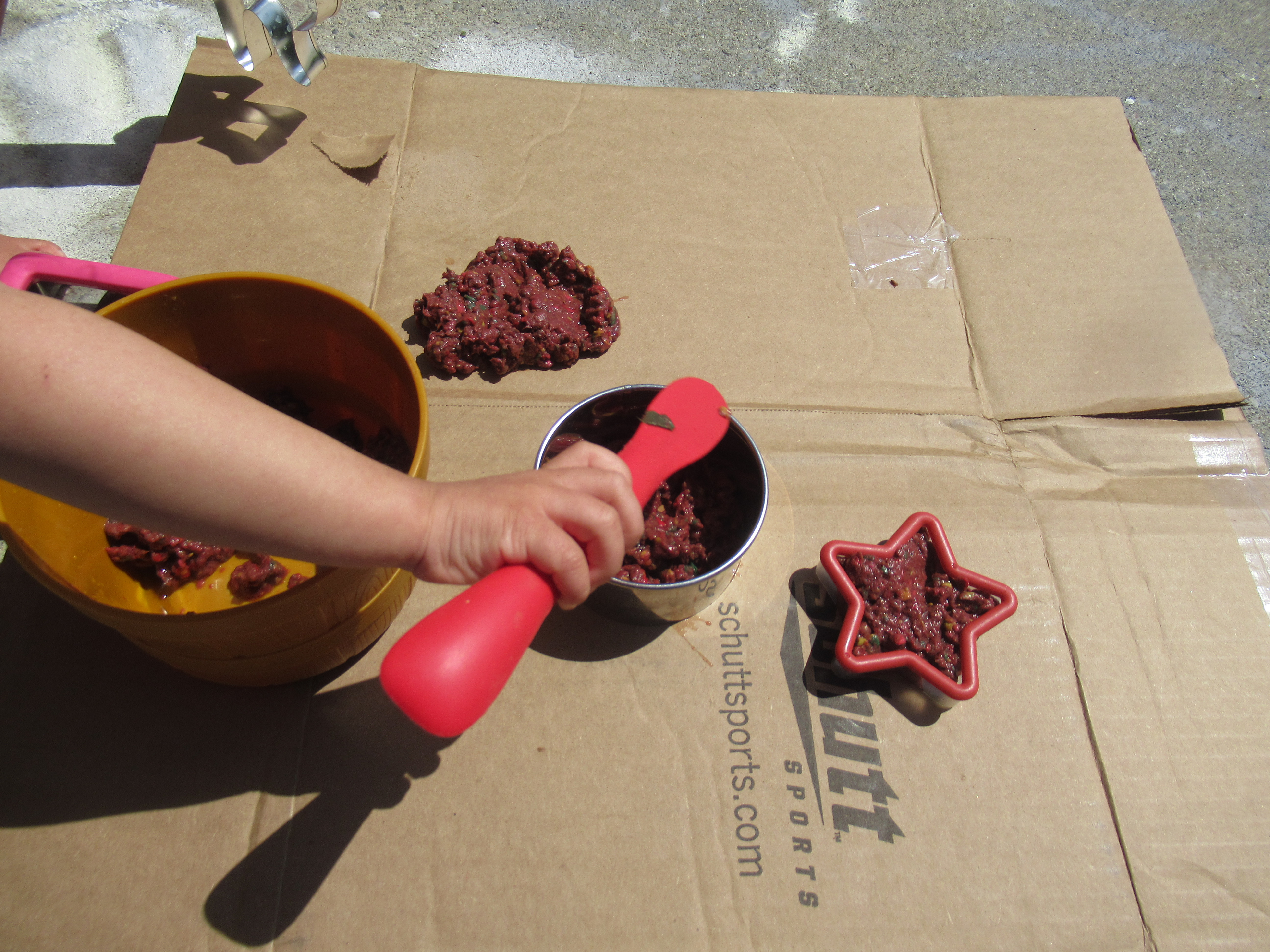 Transfer back to a bowl and stir in a packet of flower seeds, then head outside! Here’s where I needed to improvise; ideally, I would have set out the paper mush on an old window screen (or in a pinch, even a nylon stocking stretched over a hanger frame. Having neither, we just worked on a piece of cardboard, which I hoped would absorb the excess water as our paper dried.