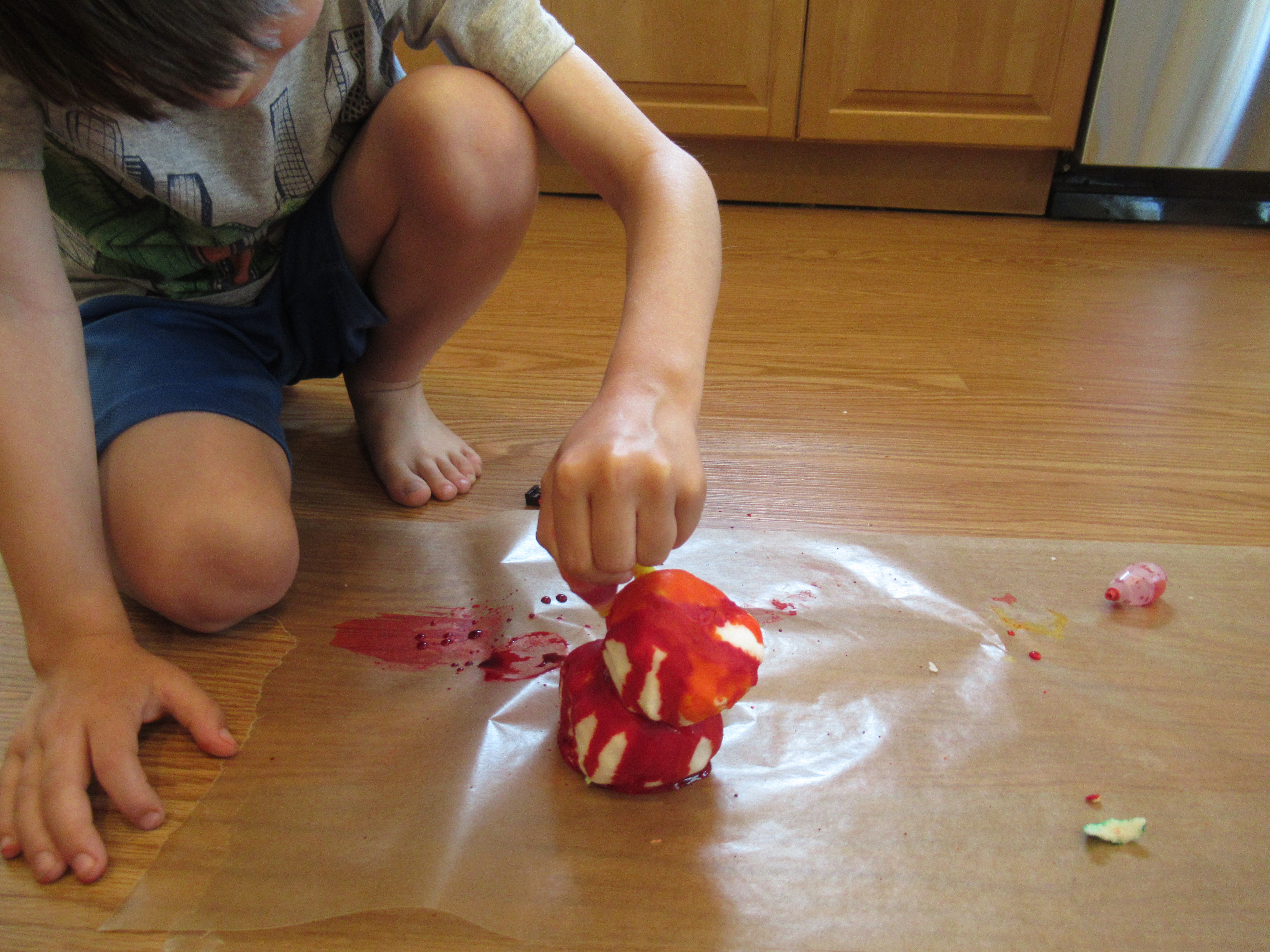 The idea for this messy hands-on play came from Parents magazine, although I had to adapt the activity slightly based on materials in our house. Still, it filled a morning of play for Veronika in the best, messiest way!
