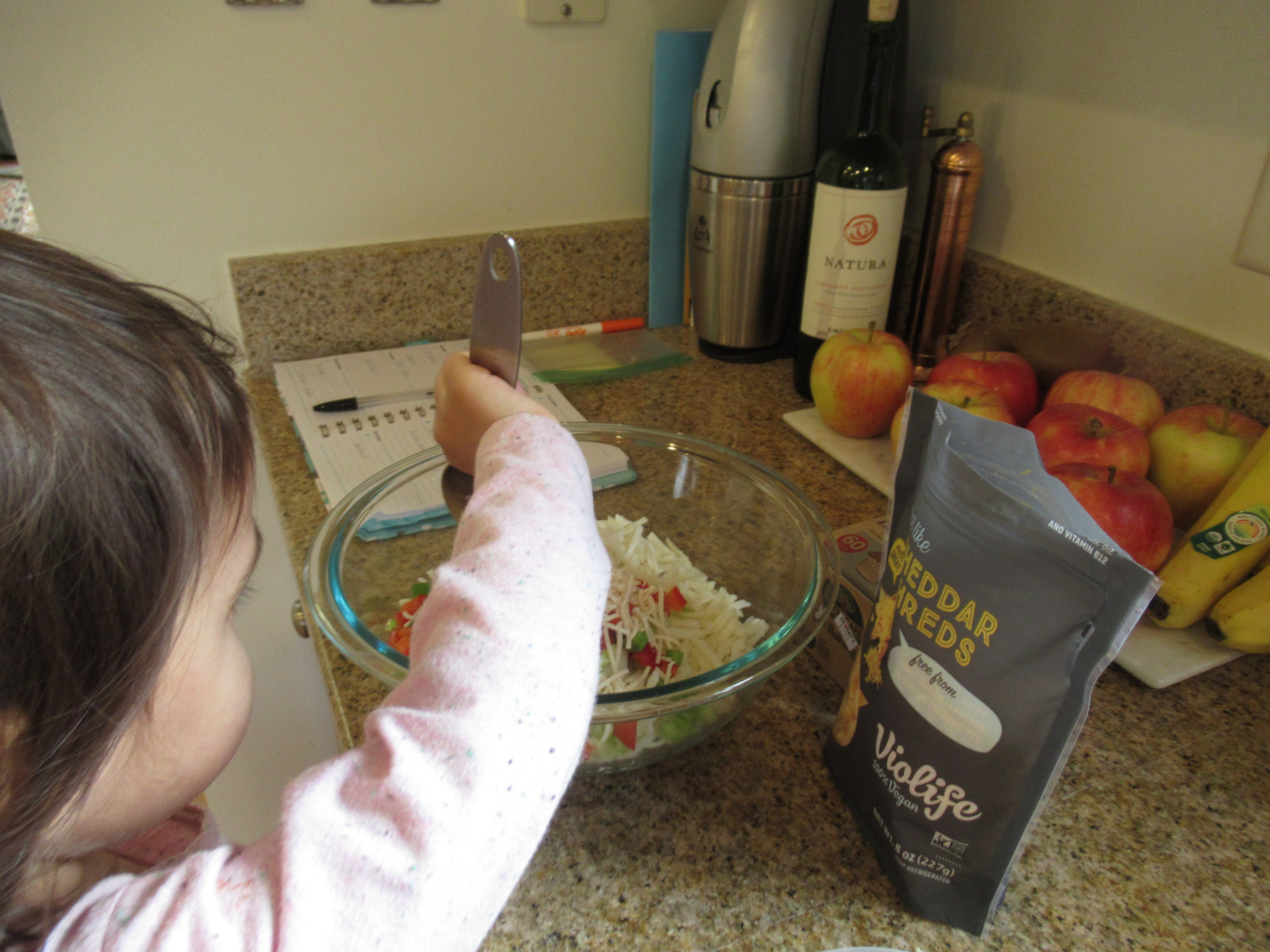 Time for Veronika to join in! She helped stir in the green onions and bell pepper, 3/4 cup shredded non-dairy cheddar, 3/4 cup shredded non-dairy Parmesan, and 1/2 teaspoon salt.