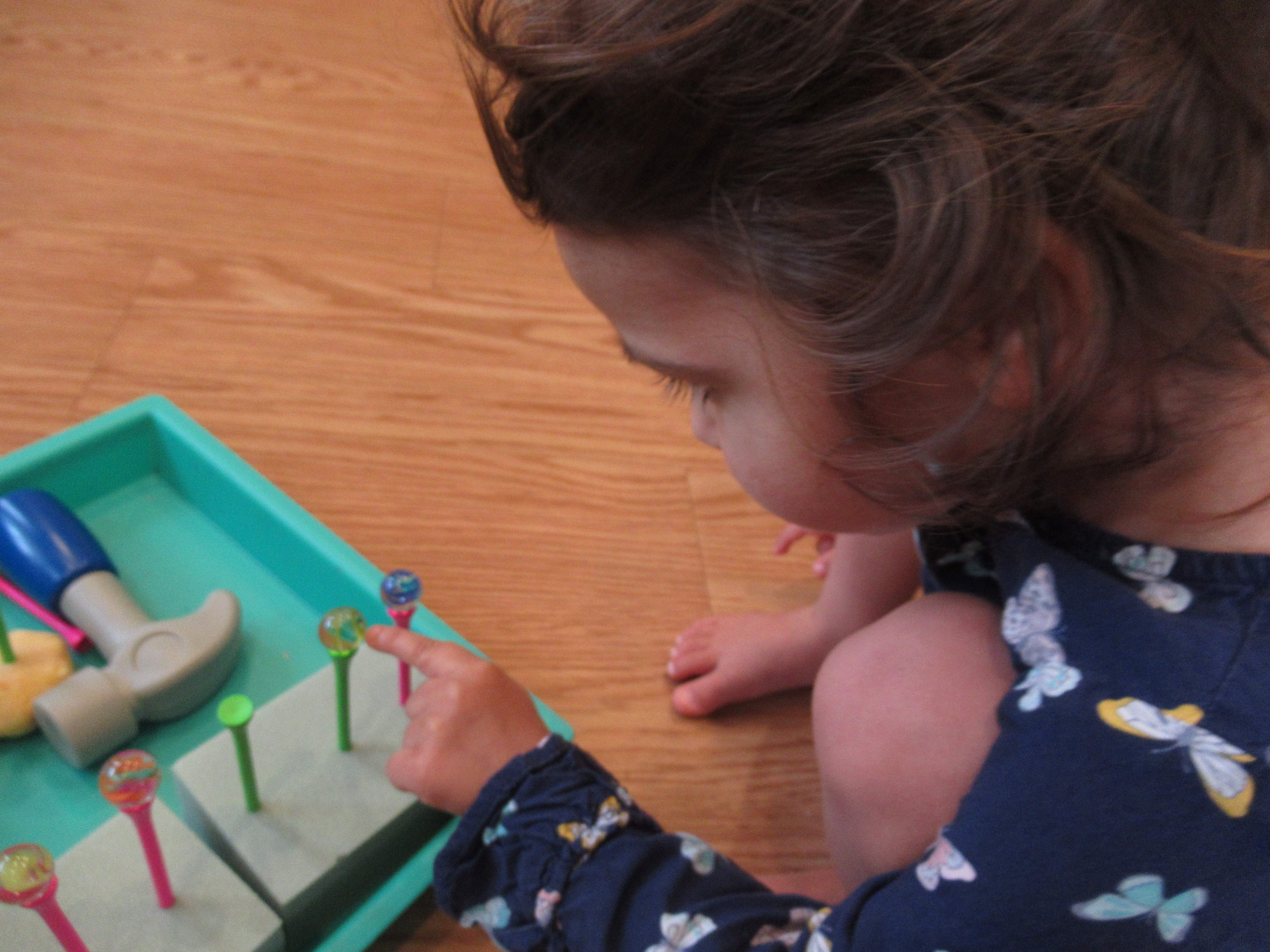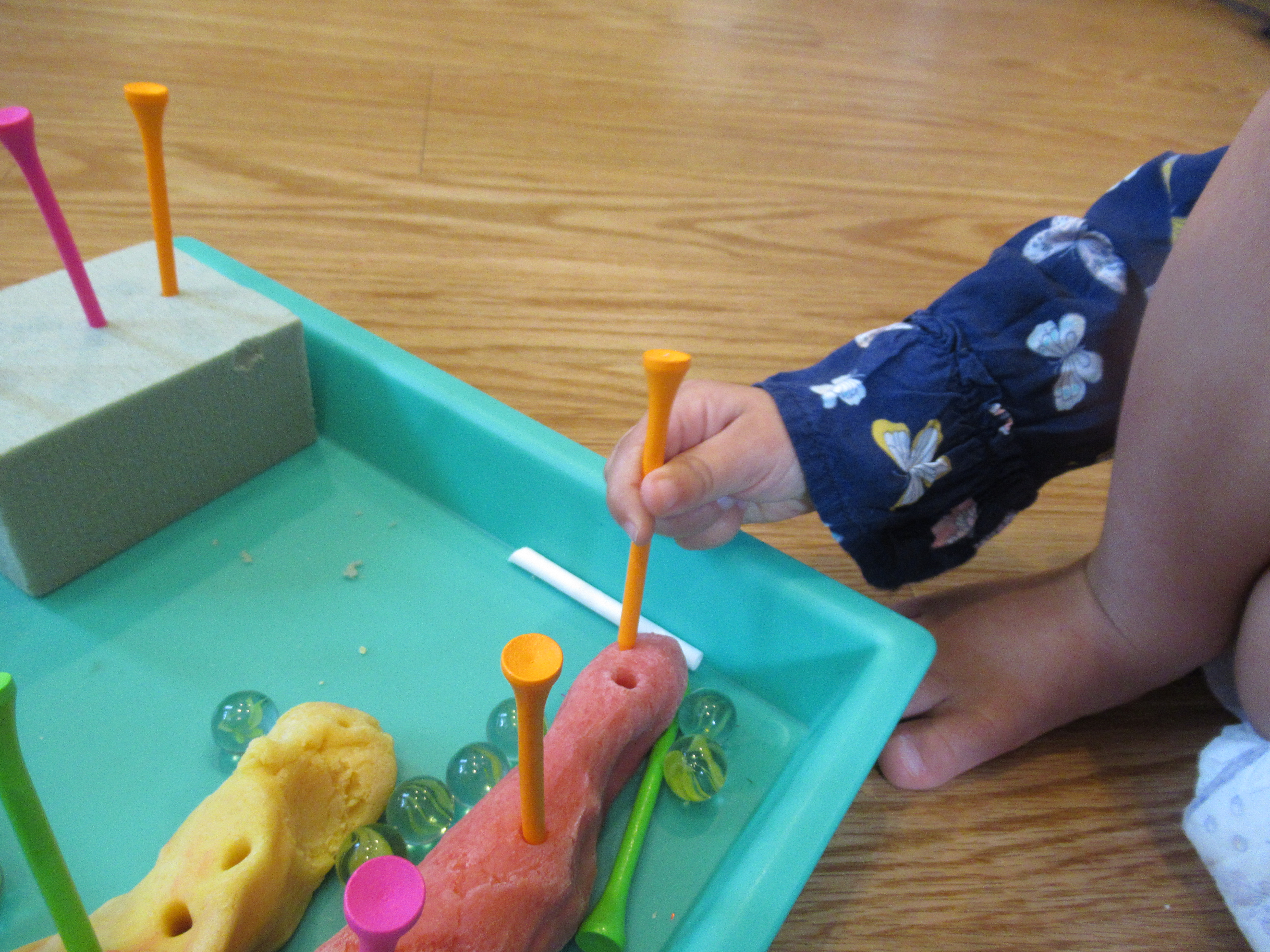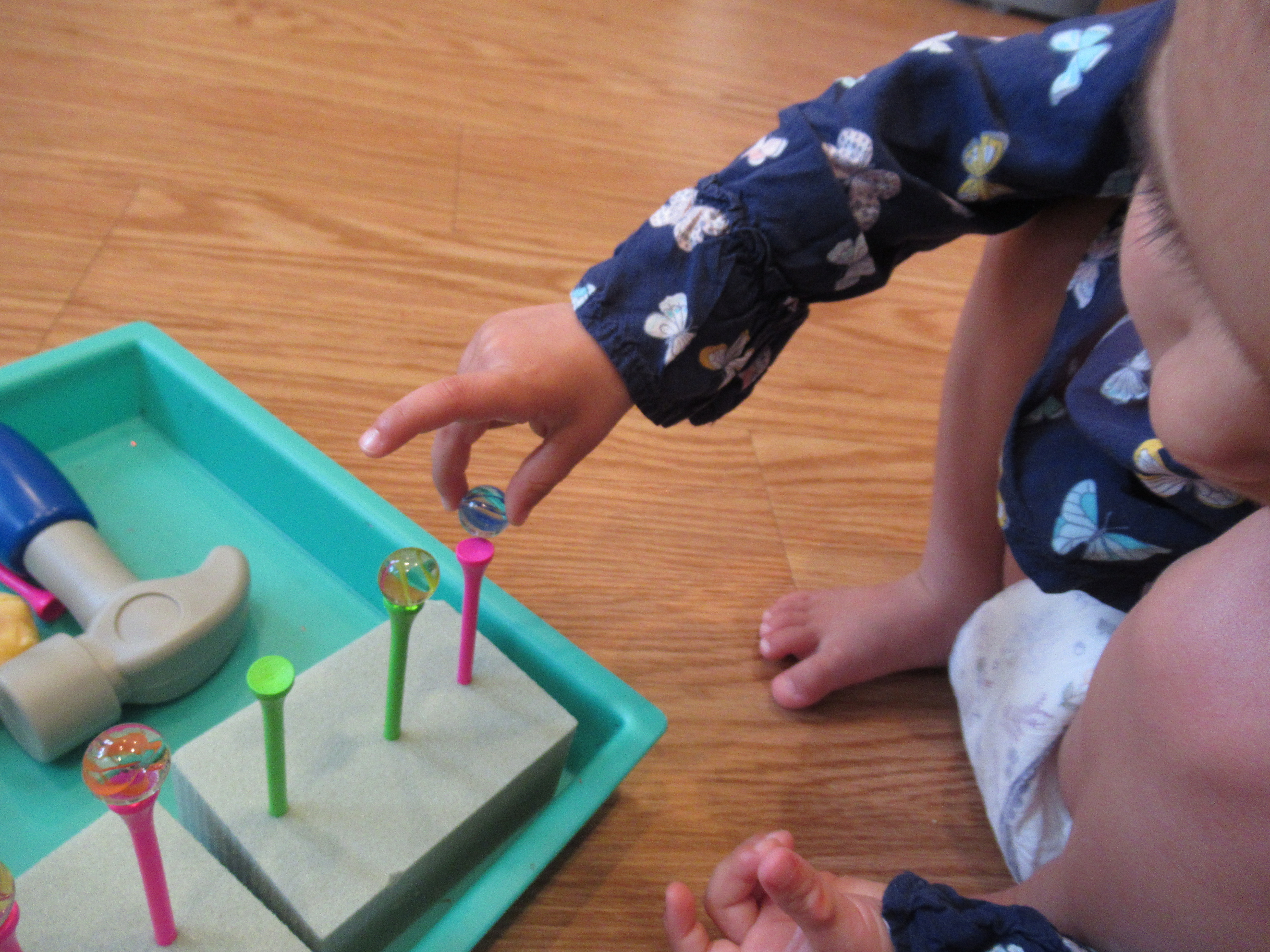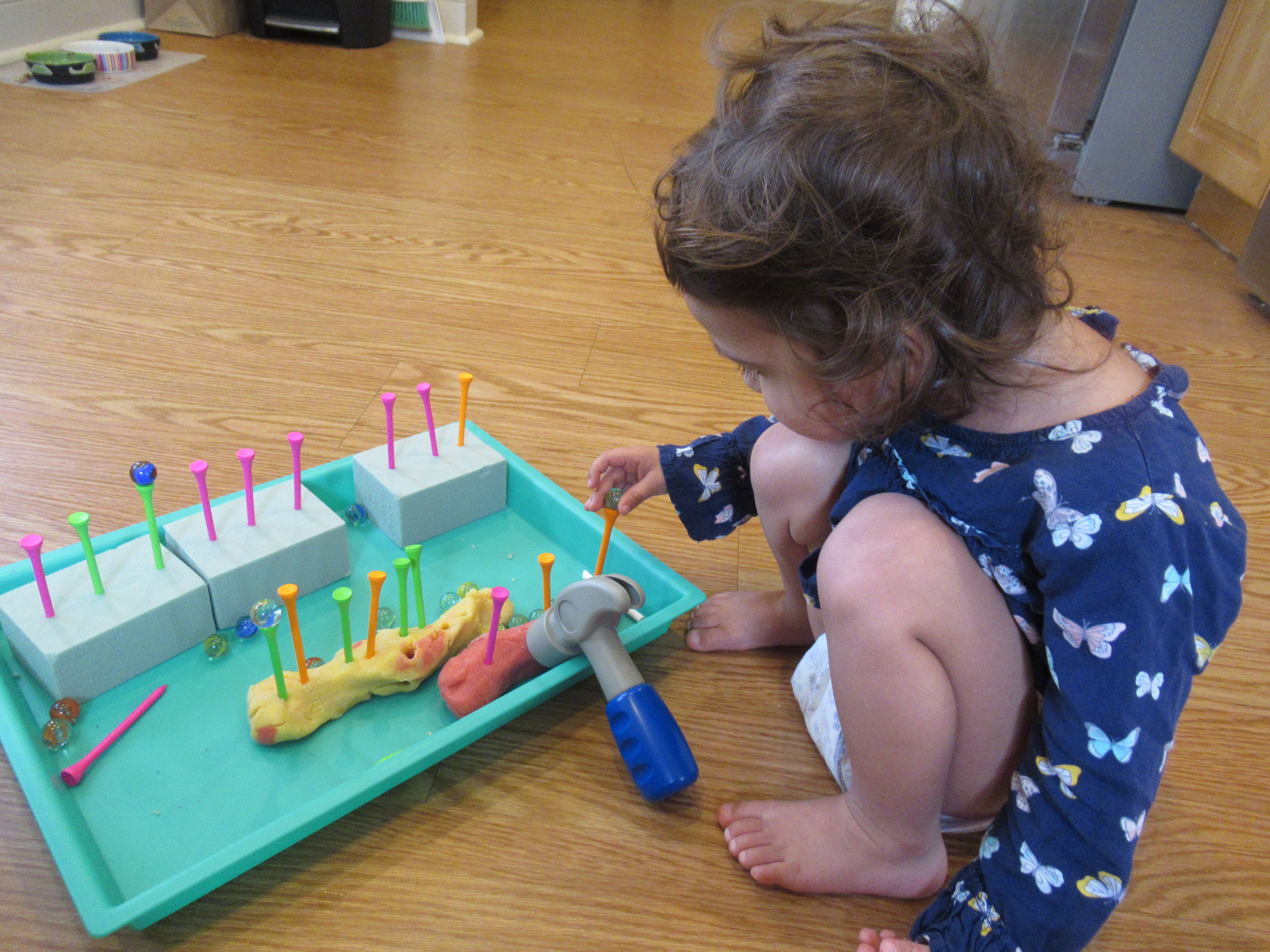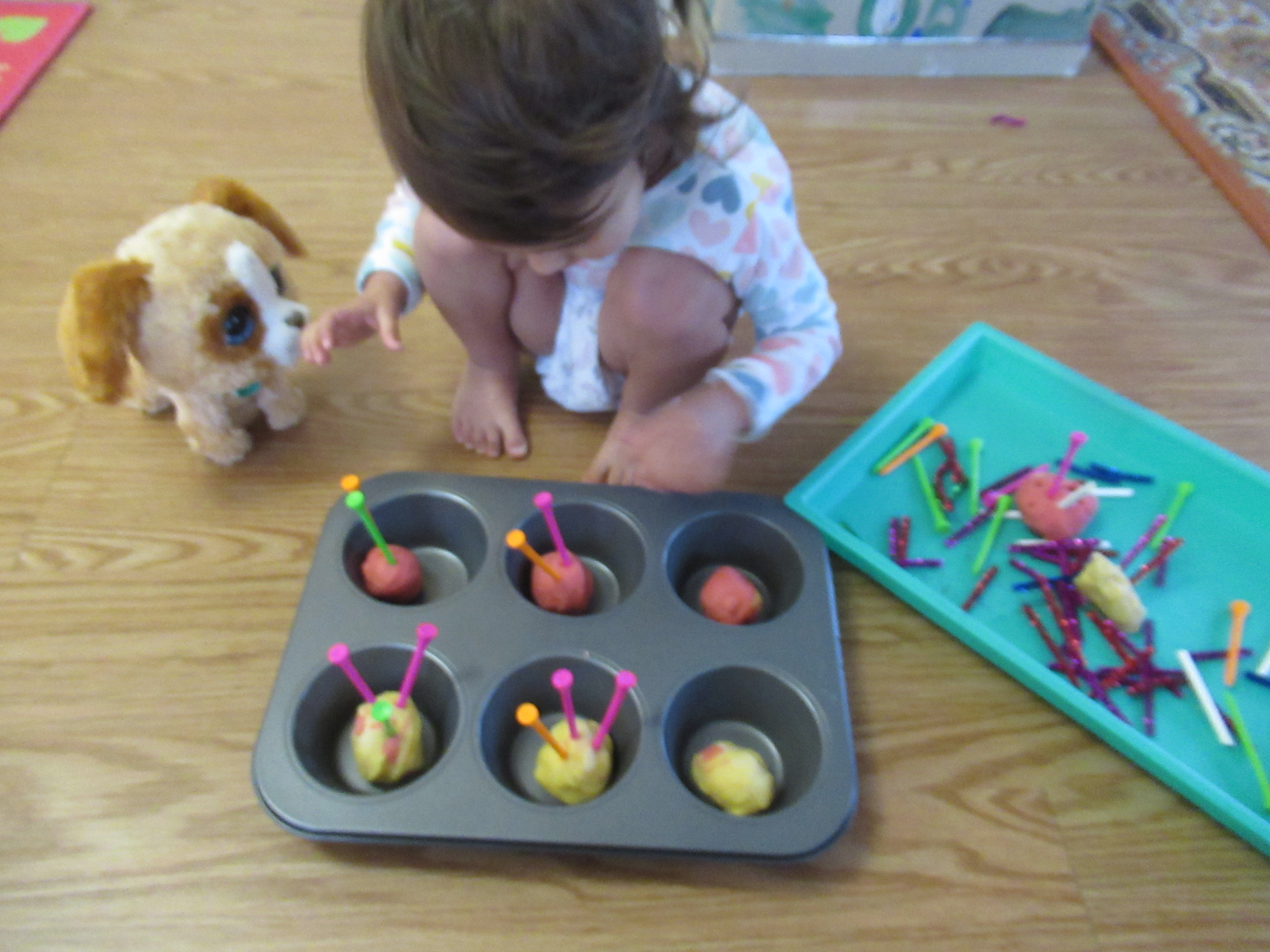 Next, she lined muffin cups with cupcake liners, proudly depositing each one!