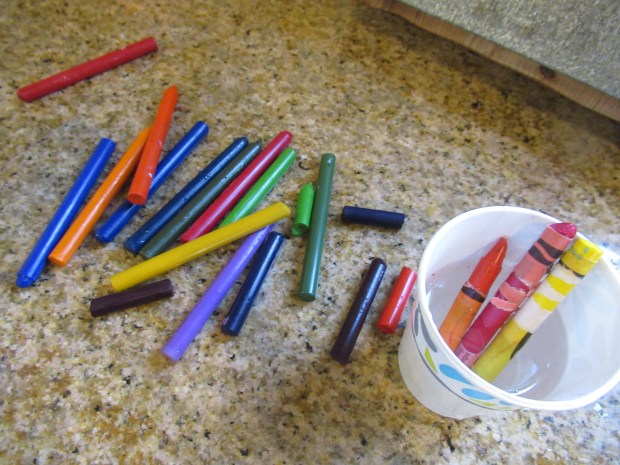 To start, I removed the wrappers from the few crayons remaining from our once-giant box. It helps to soak the crayons briefly in water, after which the wrappers slip right off.
