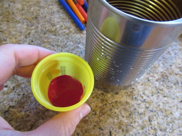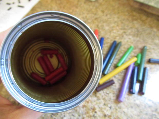 Next, you’ll need an empty tin can (I used an olive can), cleaned and dried. Working with one color family at a time, break the crayons into smaller pieces and place in the tin can. Place the tin can in a saucepan, and add boiling water around it. The wax will begin to melt almost immediately! Pour into a plastic container (empty play dough canisters were perfect!) and let set.