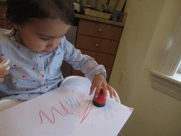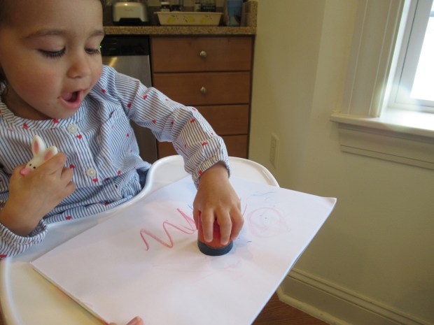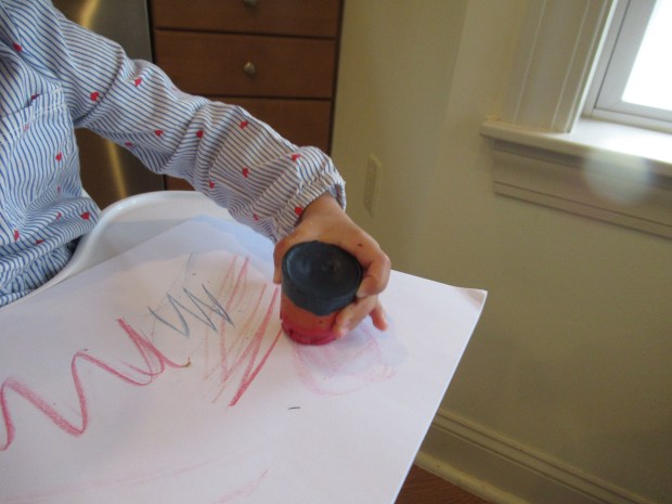“And this way is blue!” I also showed her how she could rub the crayon along on its side, showing multiple colors at once, or make big circles with it.
