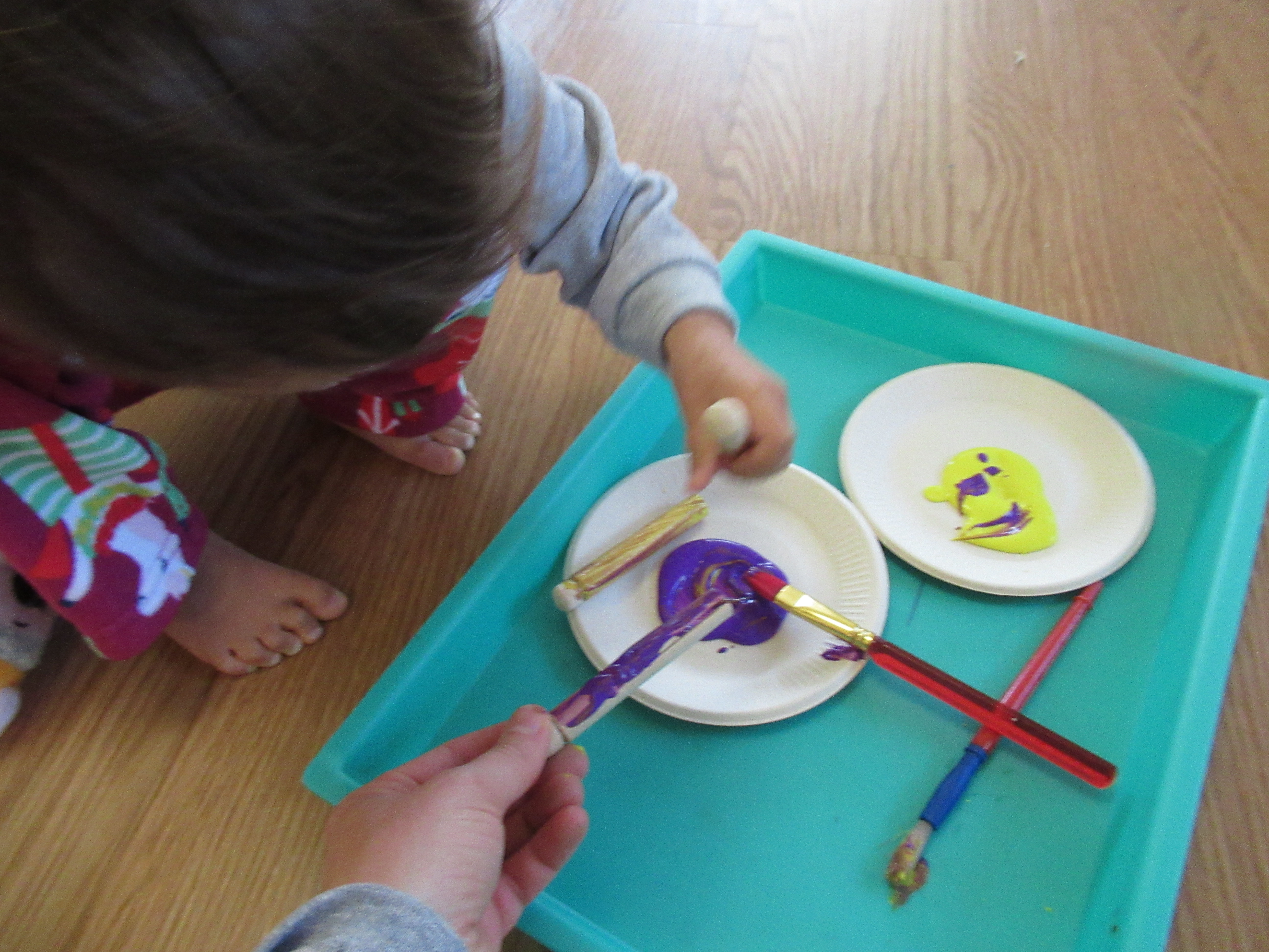 Meanwhile, we painted old-fashioned clothespins for the butterfly bodies. I thought purple and yellow would be nice springtime colors, but hadn’t bargained on her mixing them together. The color ended up a bit muddied, as a result, but they were still pretty. Set those aside to dry as well.