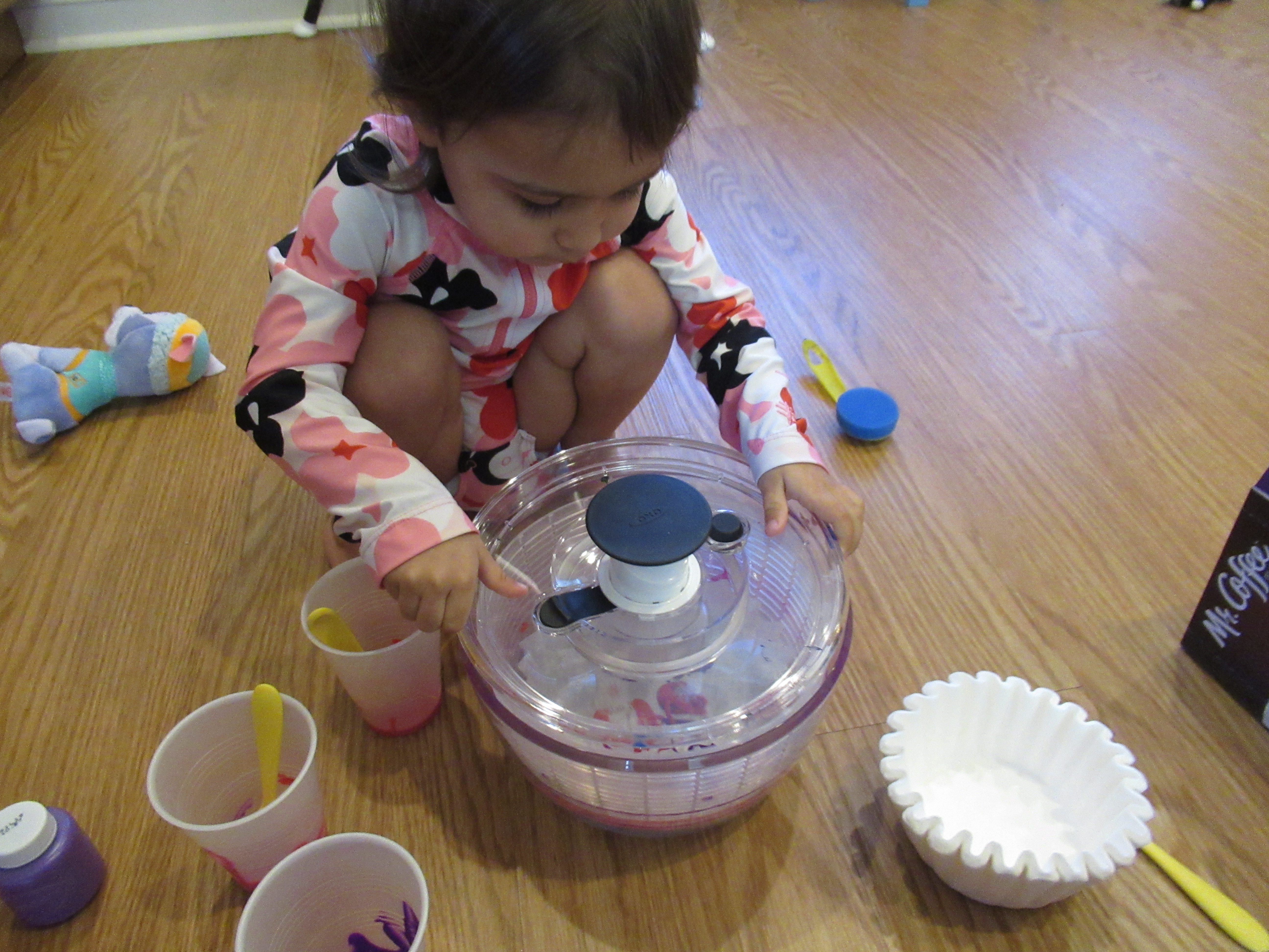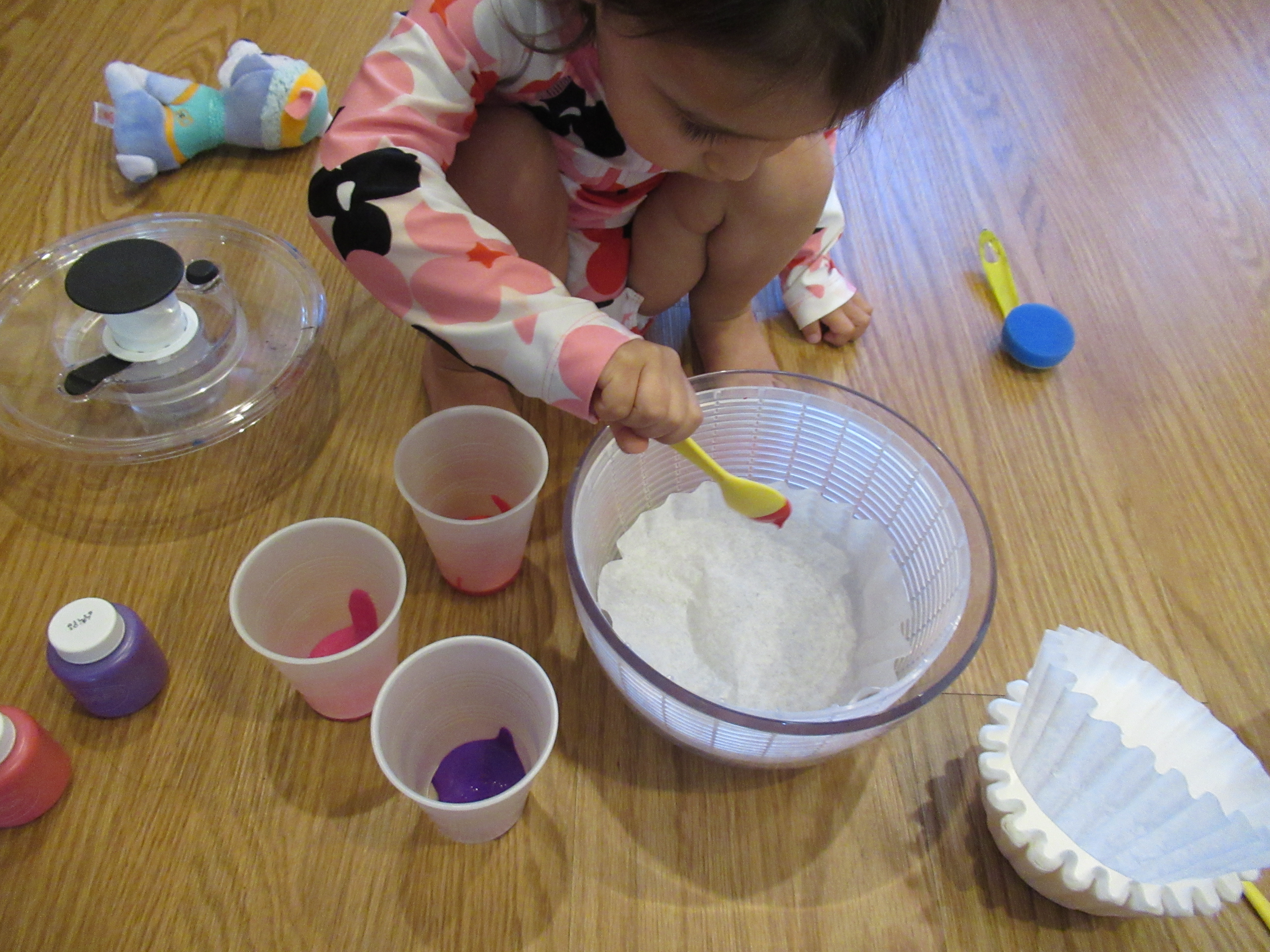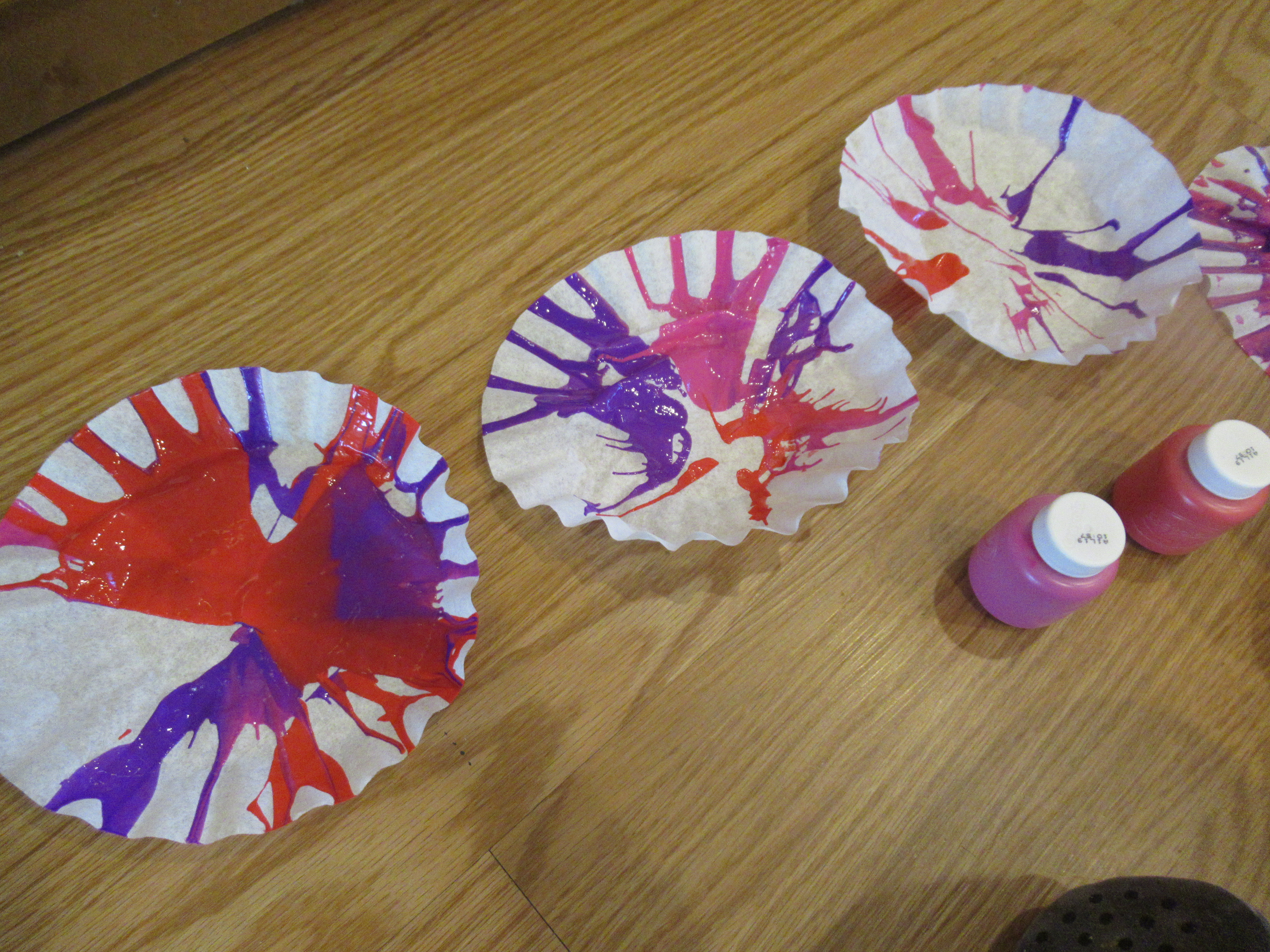 The second project was a bit more involved: coffee filter flowers! This time, we started with spin art, an old favorite. Place one filter in the bottom of a salad spinner and dribble a little paint on with a plastic spoon. We used a mix of purple, pink, and red paints.