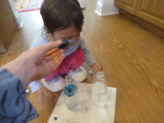 To start, we set up a classic wave bottle. Add water to an empty plastic water bottle until it’s about two-thirds of the way full. Veronika helped squirt in a few drops of blue food coloring, but even already she wanted to pick up the bottle for pouring and transferring. I had to hold her back!