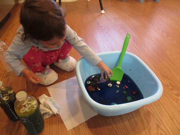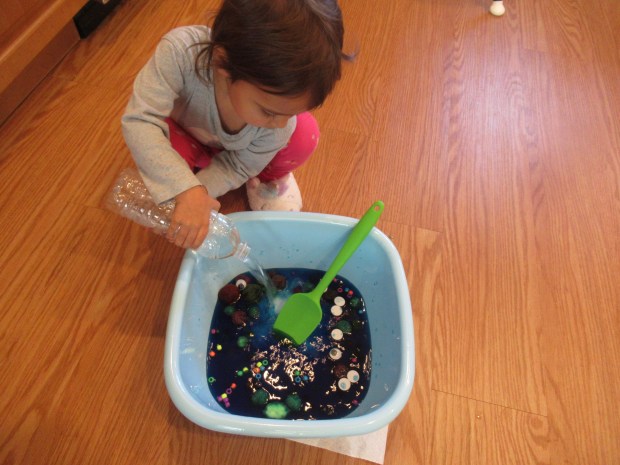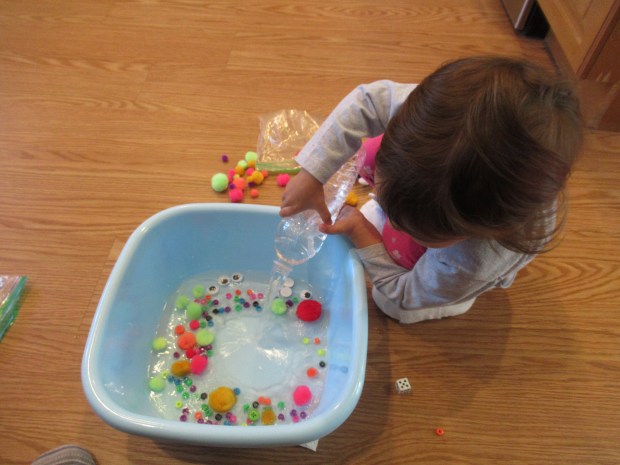 But did this hold Veronika’s interest? No! She immediately wanted hands on all the little trinkets we’d inserted into the bottles. So next we set up an “open” wave bottle. First, we placed the pom poms, beads, and wiggle eyes into the bottom of a craft bin and then she carefully poured in water from a clean bottle.