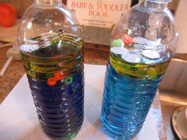 Of course the fun is meant to be in watching the items wave back and forth, especially how globs of oil will move through the water since the two substances don’t mix. The wiggle eyes, in particular, pop right to the top of the bottle no matter how you shake it, which is fun to watch.