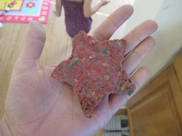 Luckily, I did manage to salvage two cookie cutter shapes: one star and one circle, and left these to dry in the sun. After about 5 hours, we checked on the shapes. They weren’t completely dry, but had set enough that we could remove the cookie cutters and then finish the drying process inside.