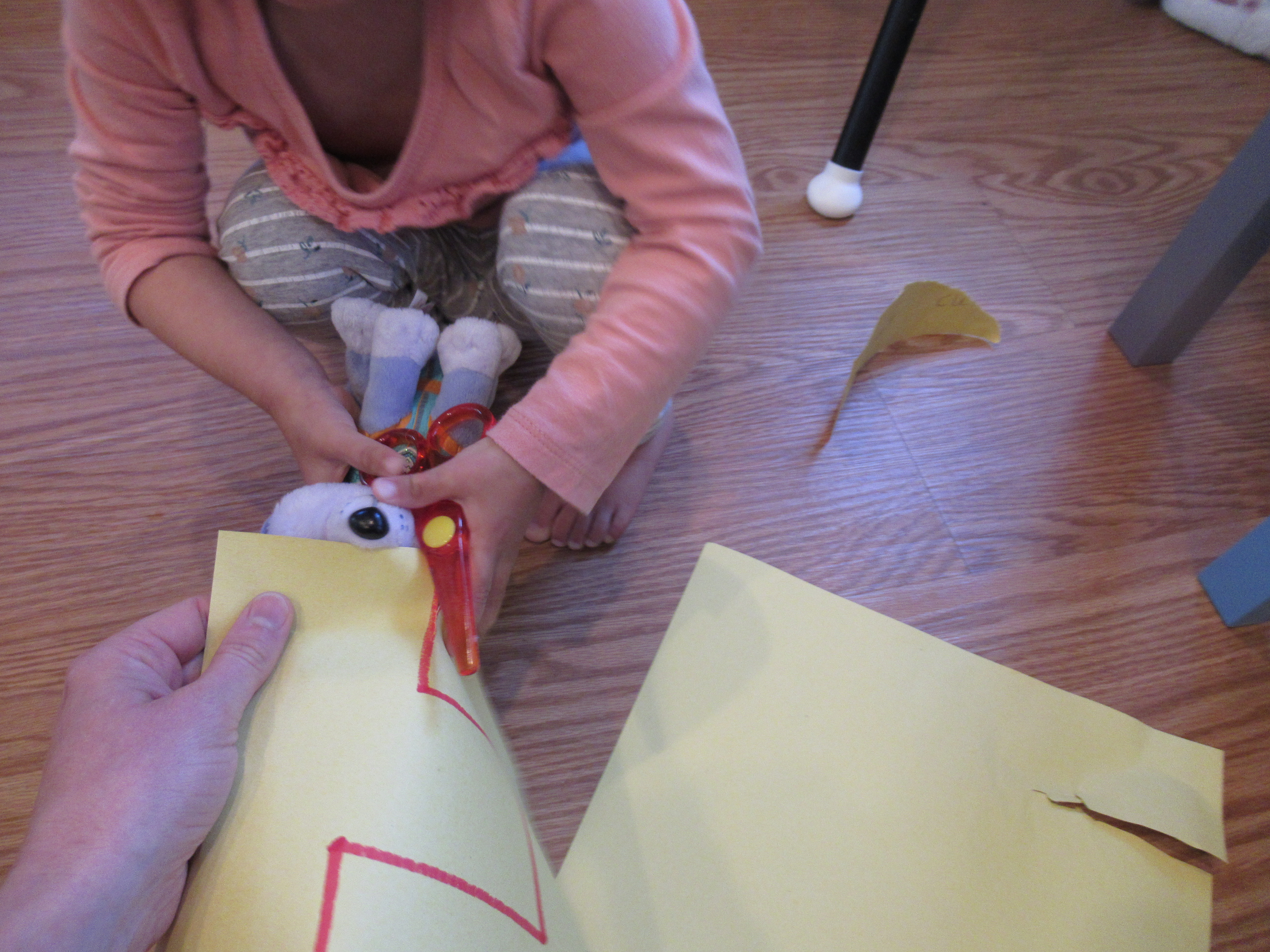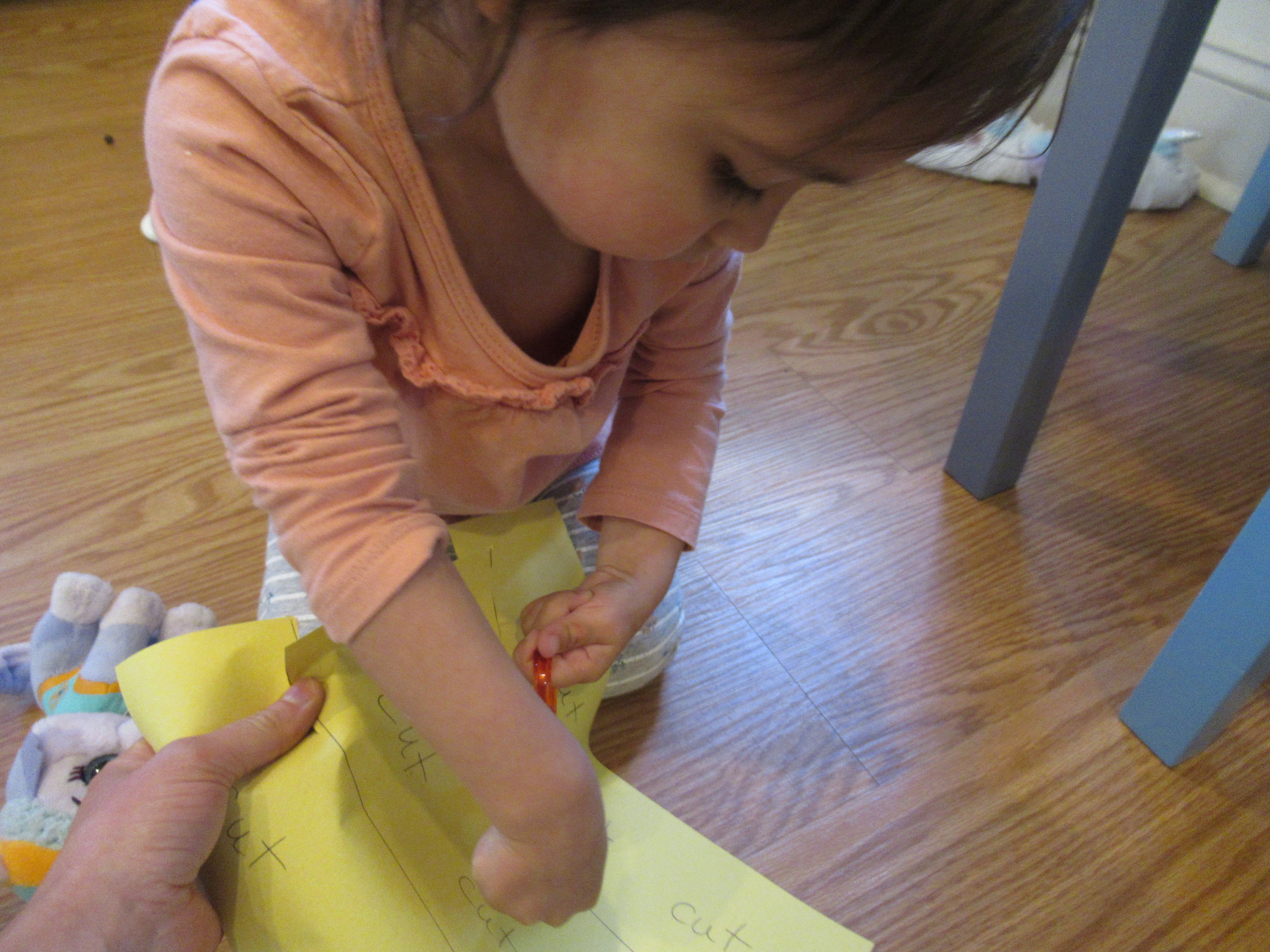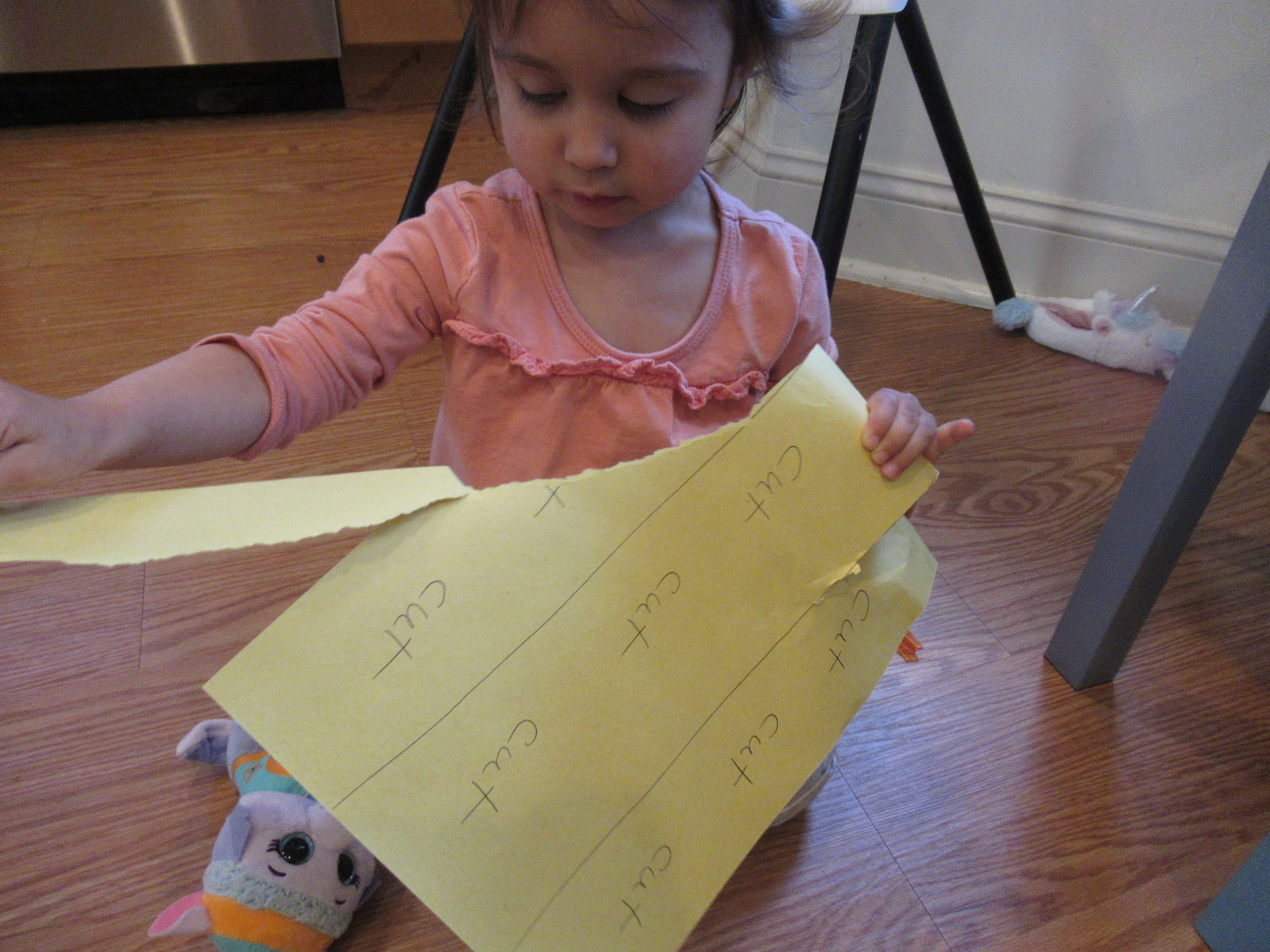 I then presented Veronika with a variety of items from the craft bin that she could adhere. My original intention was to use pom poms, but we recently used ours up! Still, there were plenty of materials to test out. Some, such as strips of gift ribbon or pipe cleaners, she could pull up easily.