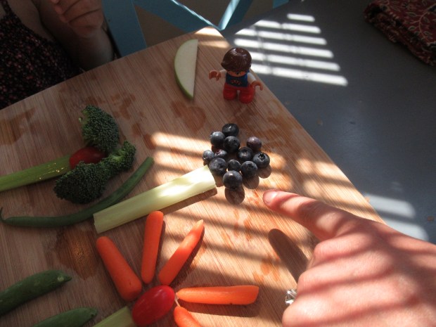 I set out the plate, along with a cutting board for a “canvas”, and invited Travis to form the items into flowers.