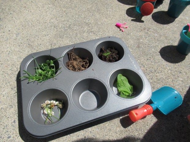 To start, I sent Veronika hunting around the yard to find treasures. With some mommy help, we then sorted these into the compartments of a large muffin tin, including flowers, grass, leaves, wood chips, and dirt. We also left one compartment empty.