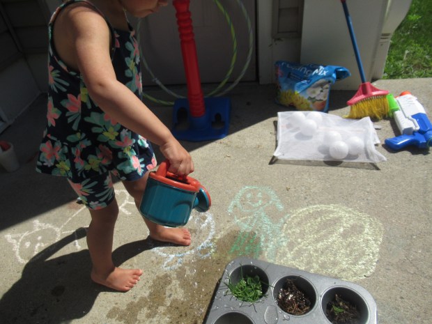 But for others (spoiler alert: wood chips and dirt), the water wasn’t there for her to see any more. It was time to introduce new vocabulary: the dirt had absorbed the water! The flowers and grass had not.
