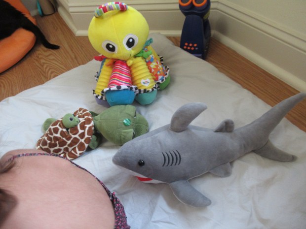 To start, I laid down a blue blanket (for water) and a beach towel (for sand). Into the water went a variety of sea creatures from the stuffed animal bin, including a shark, octopus, and sea turtle!
