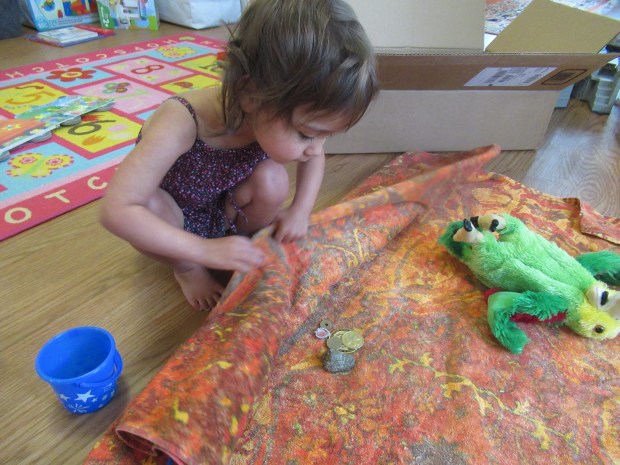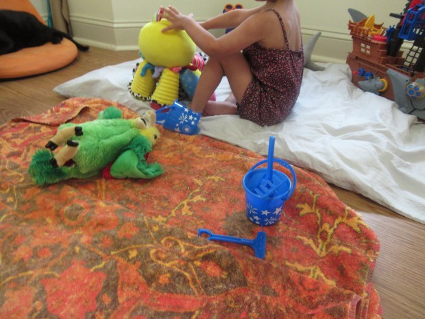 Veronika loved digging in the sand (e.g. turning back the corner of the towel) to unearth the shining coins and jewels I’d hidden from the dress-up box.
