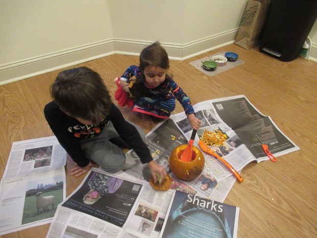 You’ll need to start with a carved jack o’ lantern, which is not provided in the crate itself but certainly not a problem in the fall! We picked a medium pumpkin at a local farmstand and the kids loved first gutting their victim (er, scooping out the pumpkin seeds). Little did poor Jack know he was about to get sick!