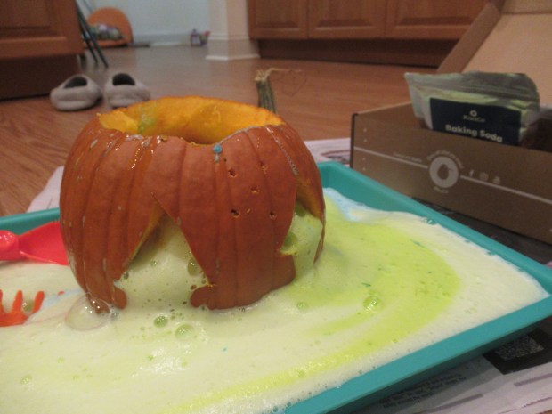 Travis helped prepare the pumpkin according to the crate’s instructions: three scoops of provided baking soda, 1 scoop of foaming gel, and the color of choice (he picked blue).