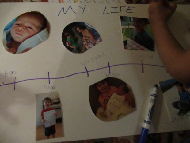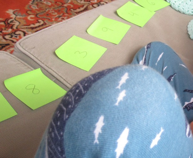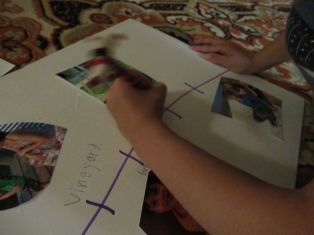 Finally, we took the play home to our backyard where we set up an obstacle course using plastic stepping stones. (Note: you can use natural elements, too, like clumps of grass or piles of leaves). The challenge was that Travis had to think of a new verb each time he went through the course, whether to tip-toe, to run, to stomp…