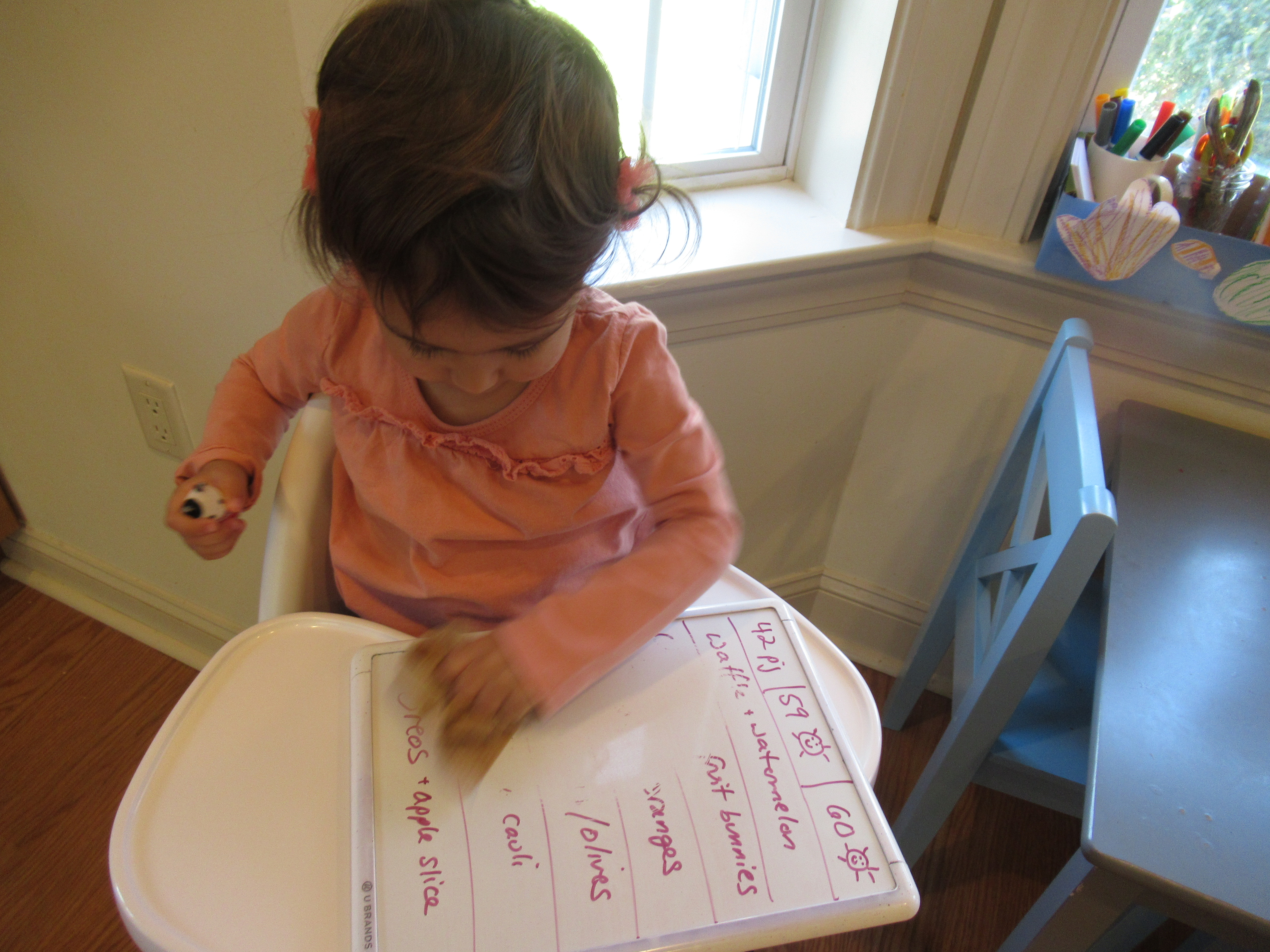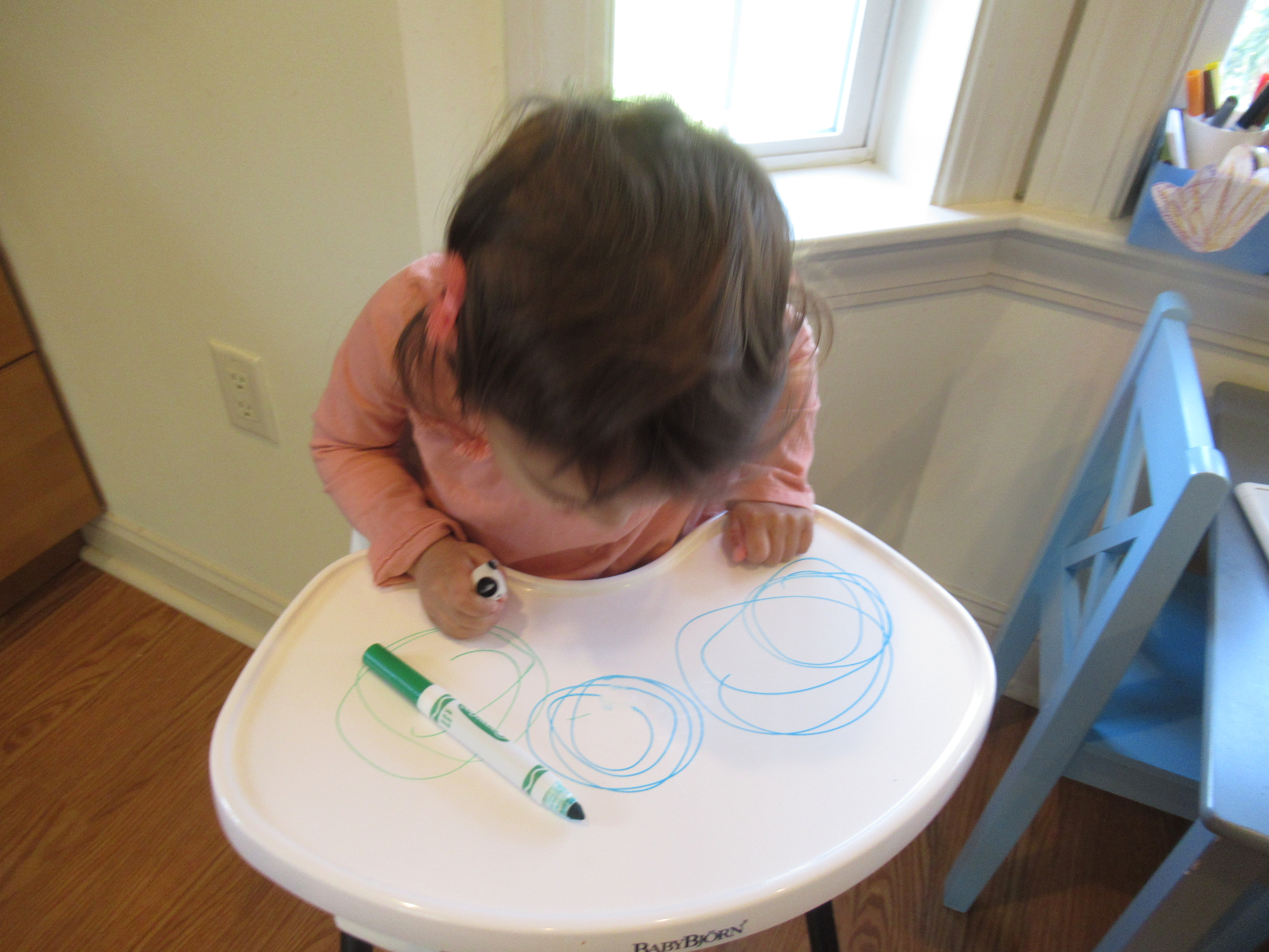 Yup, I let her draw right on that high chair tray! Use washable markers and watch your child’s eyes pop when he or she is allowed to scribble directly on the tray.
