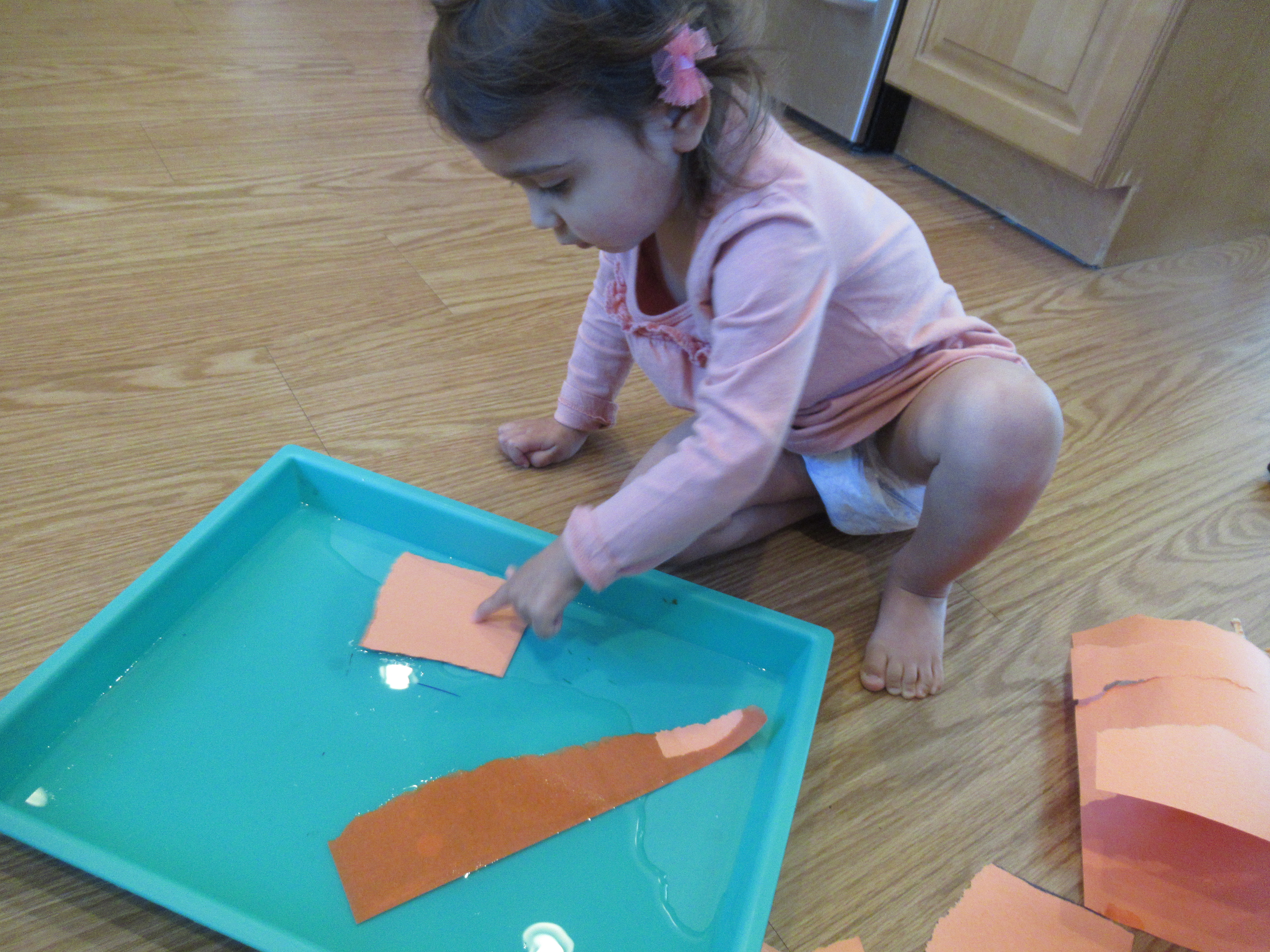 Veronika loved watching the changes that took place as soon as the paper hit the water. The texture changes, the color gets darker, and we even discovered that it was easier to rip! While she was at it, she wanted to pull something else apart, which led to…