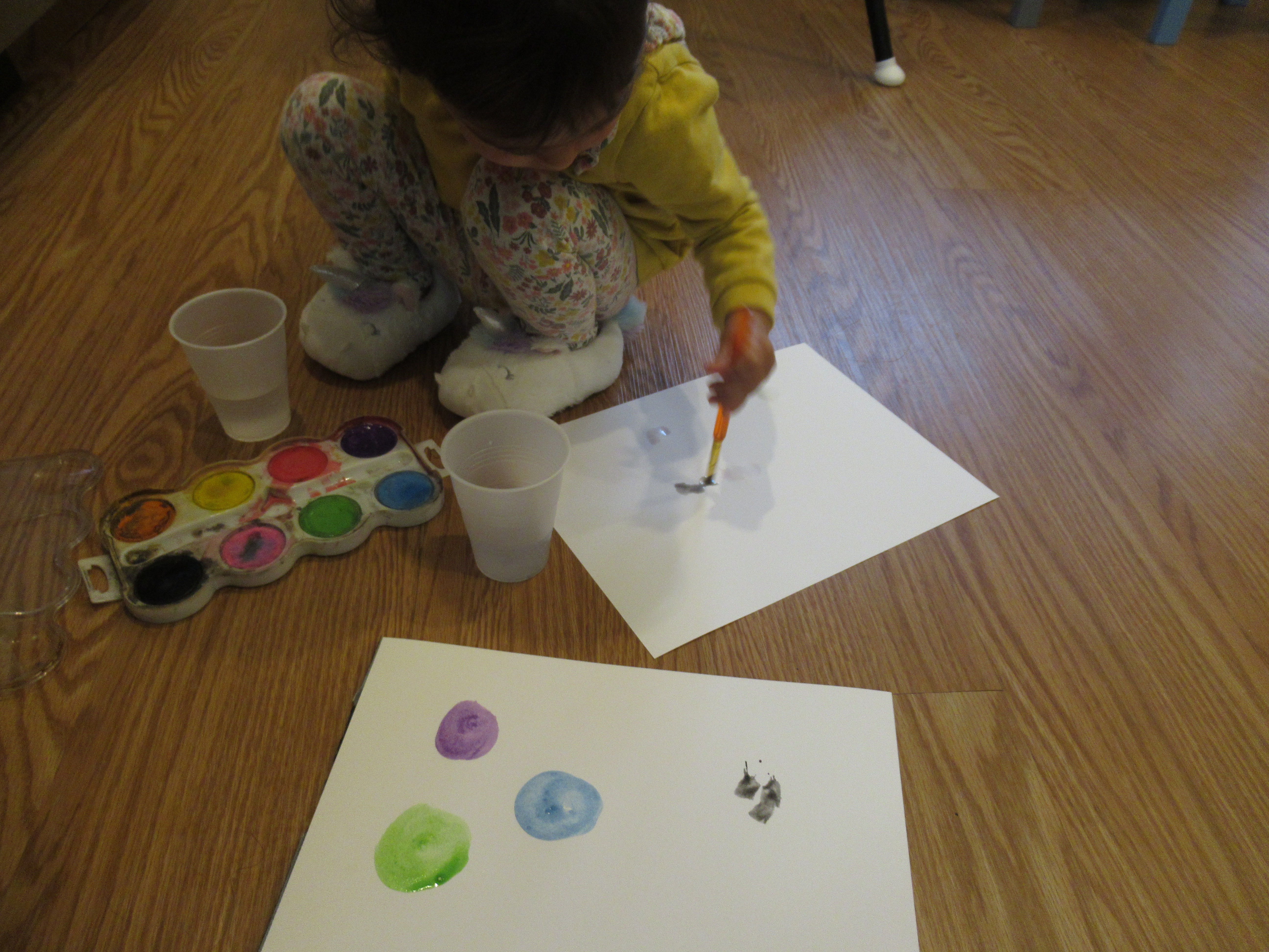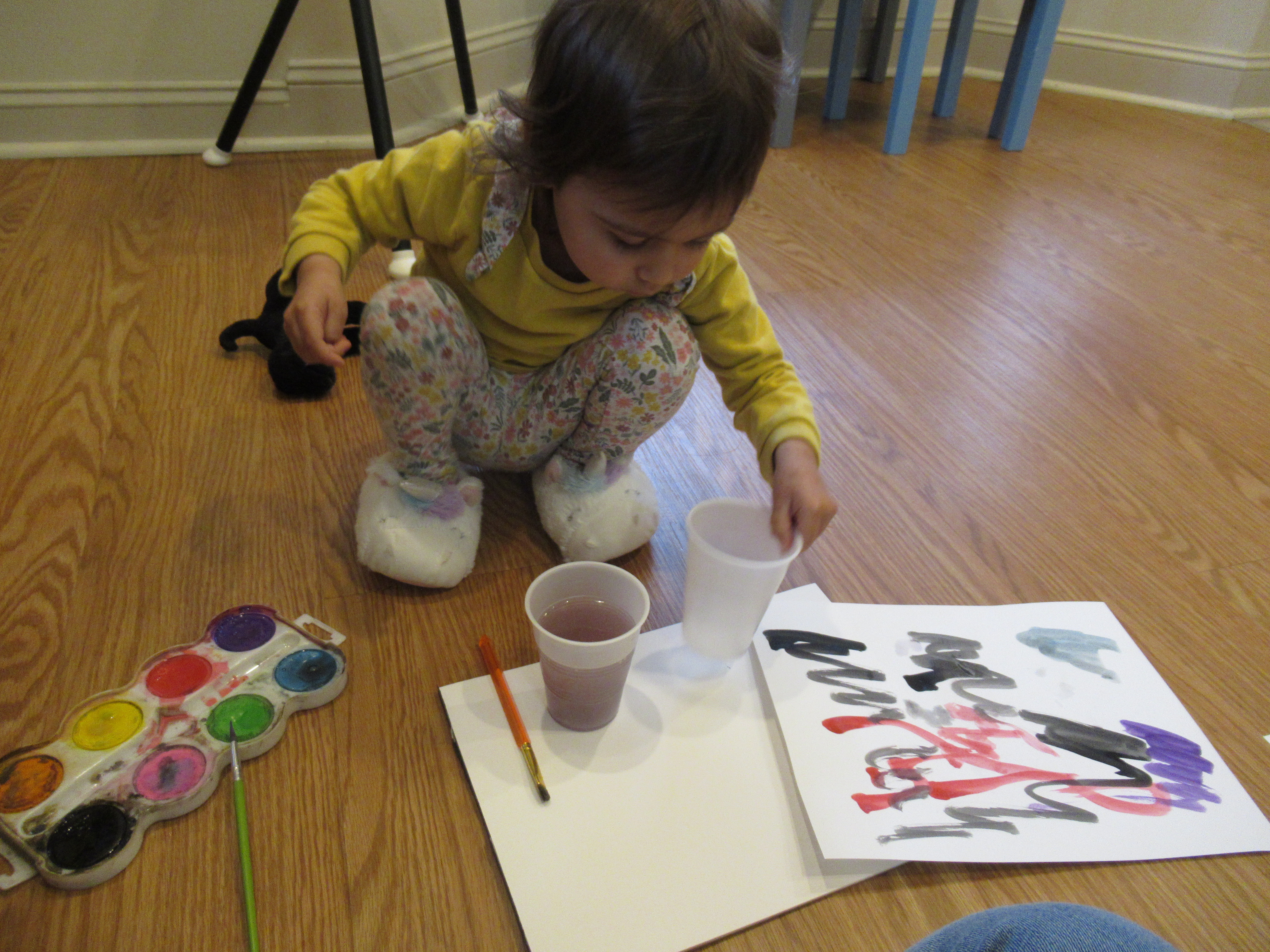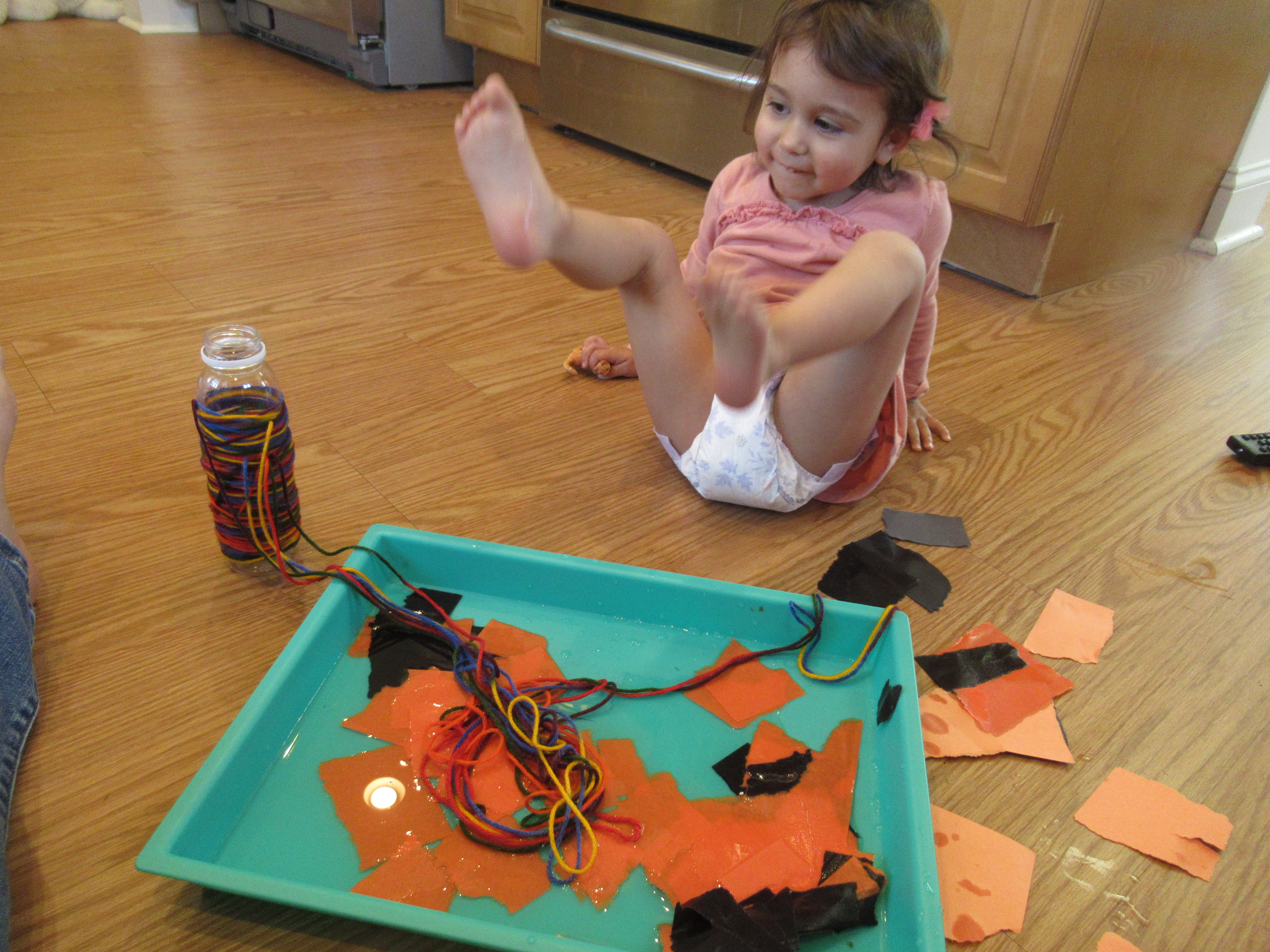 She couldn’t resist pulling the strands of yarn off a recent project, and then of course needed to see how those felt once wet, too. Pretty soon that led to wet fingers and toes. “It’s like a sprinkler!” she said. We quickly mopped up and headed to the living room for something a little less wet.