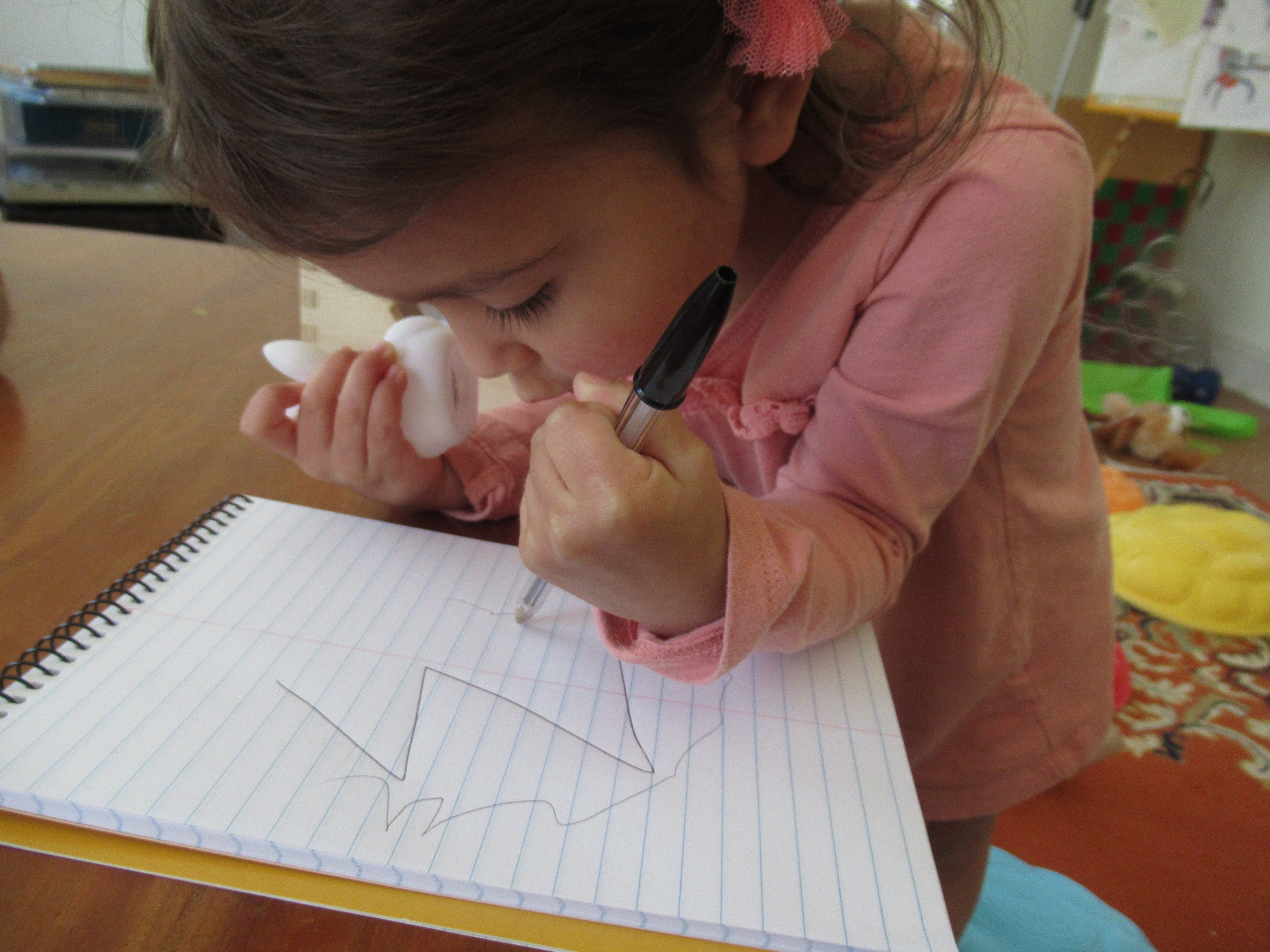 I made one line with a pen, then invited her to add to the drawing! Veronika loves to draw like this, so seriously that she looks like a mini studio artist. “I’m not done yet,” she told me, adding more squiggles and lines.