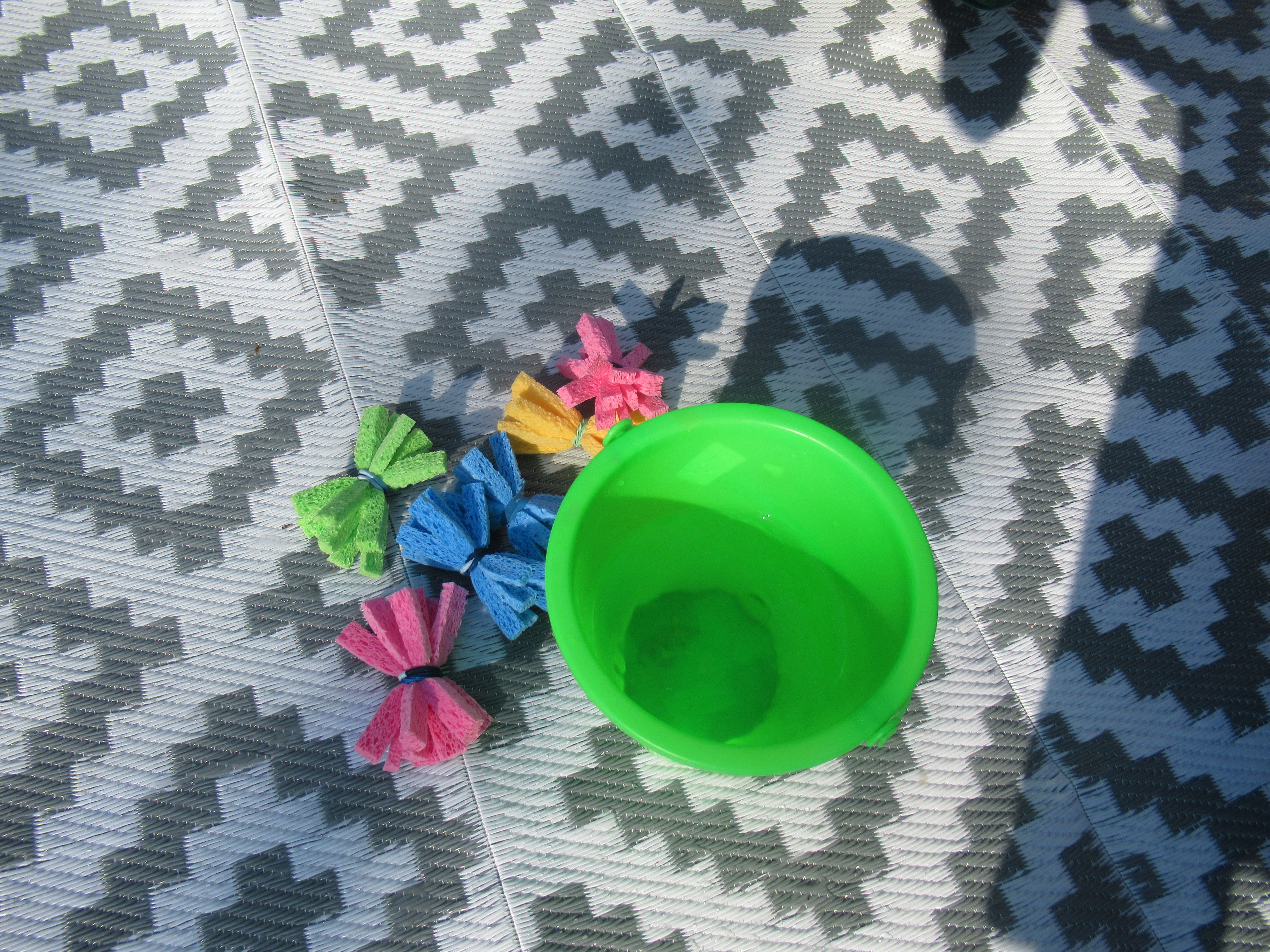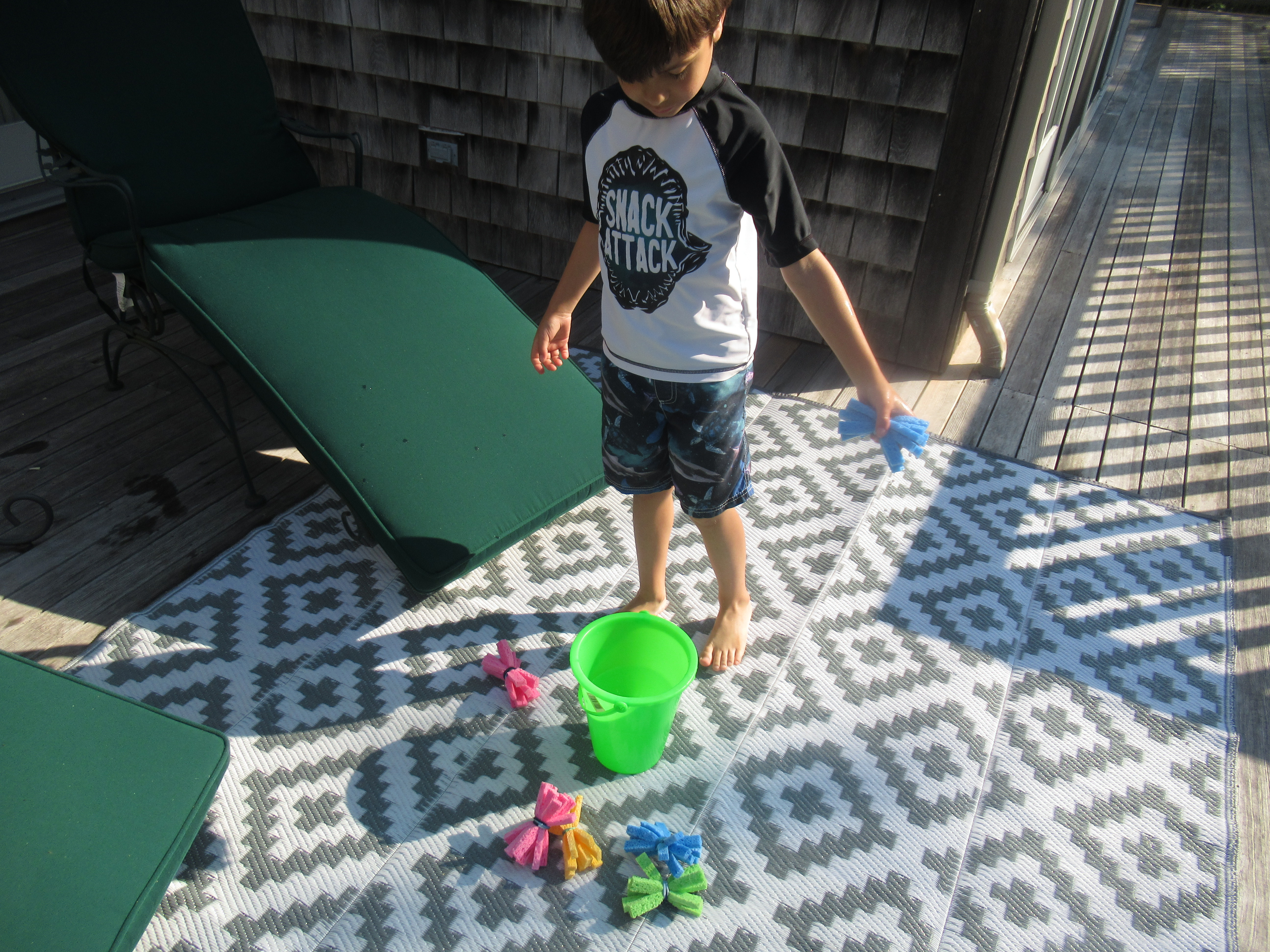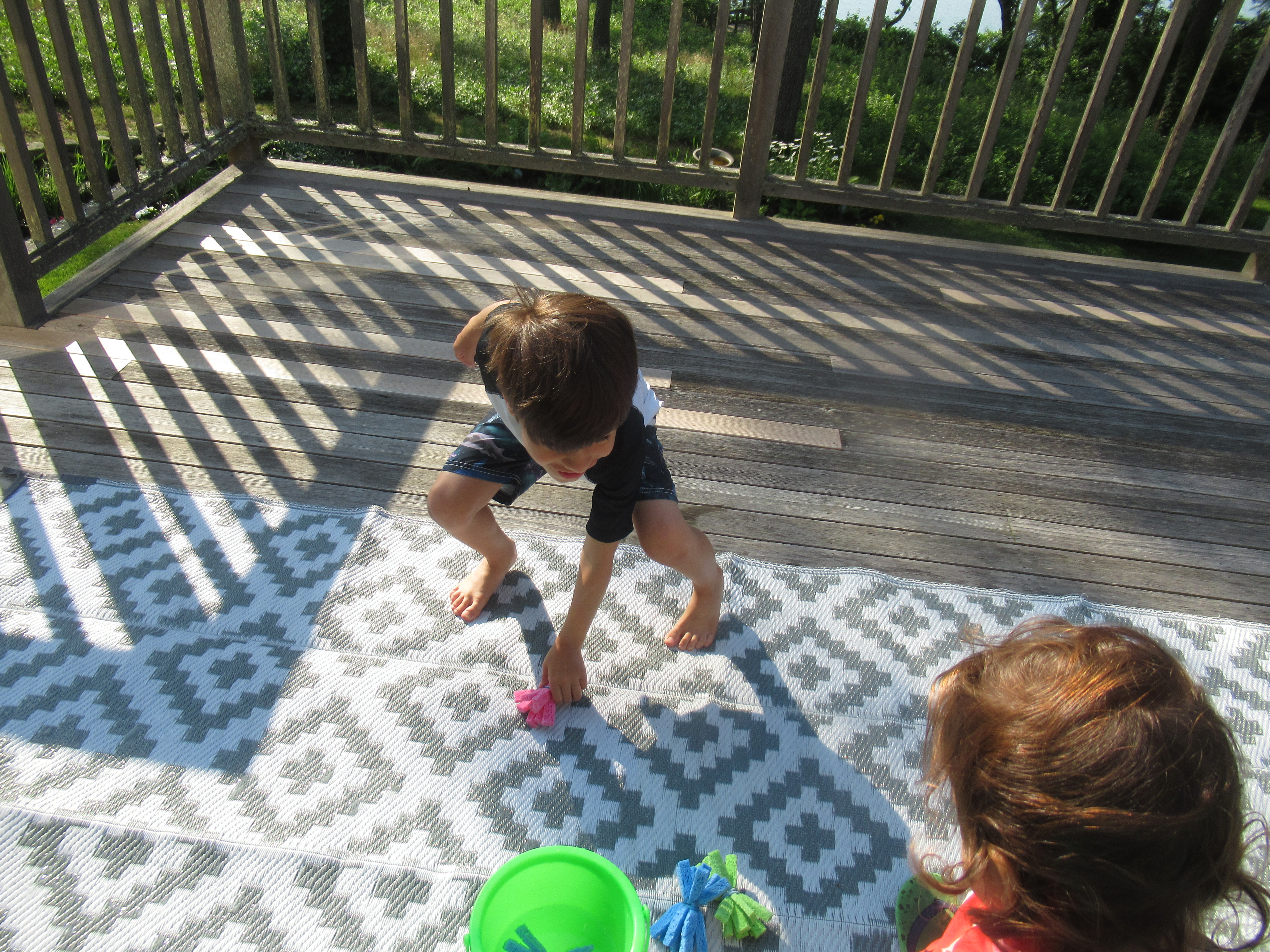 In the morning, we headed out to the patio with the pops and thick white paper. Sure enough, the food coloring made beautiful swirls of color, and the hot sun meant our efforts were quickly rewarded with smudges of “paint” on the paper.