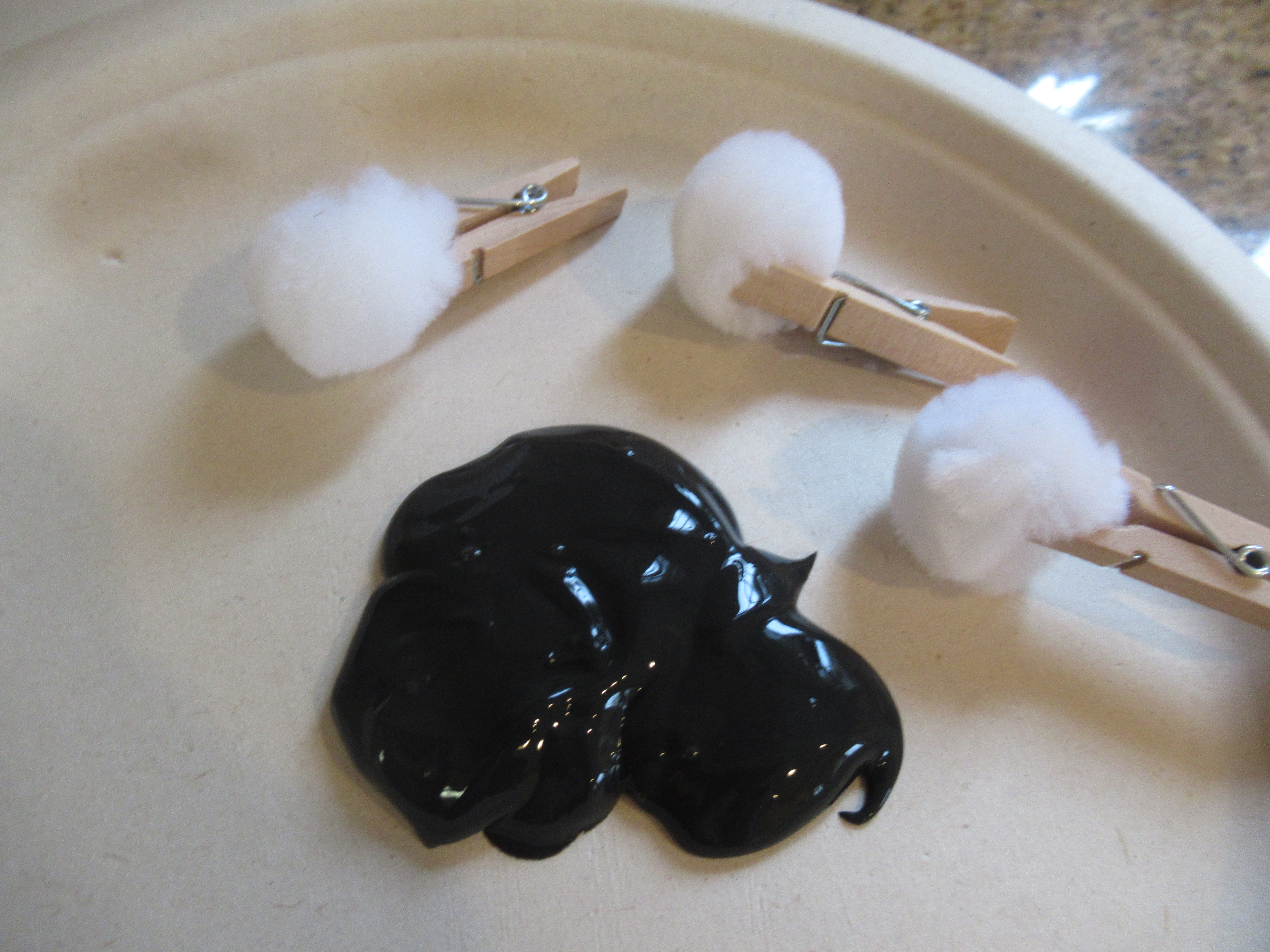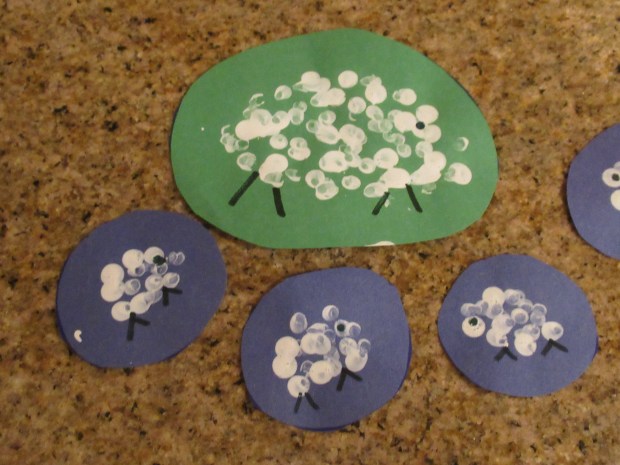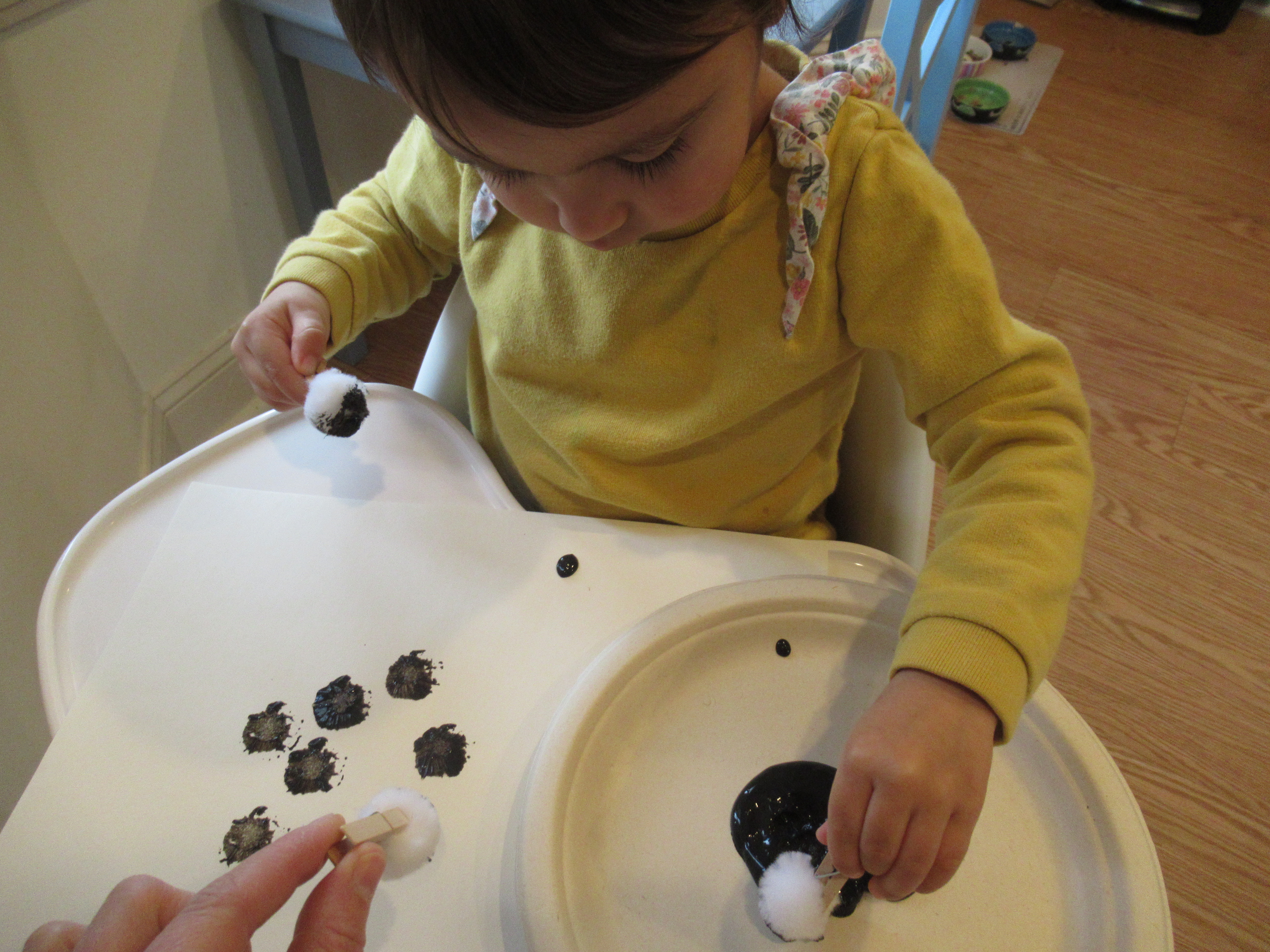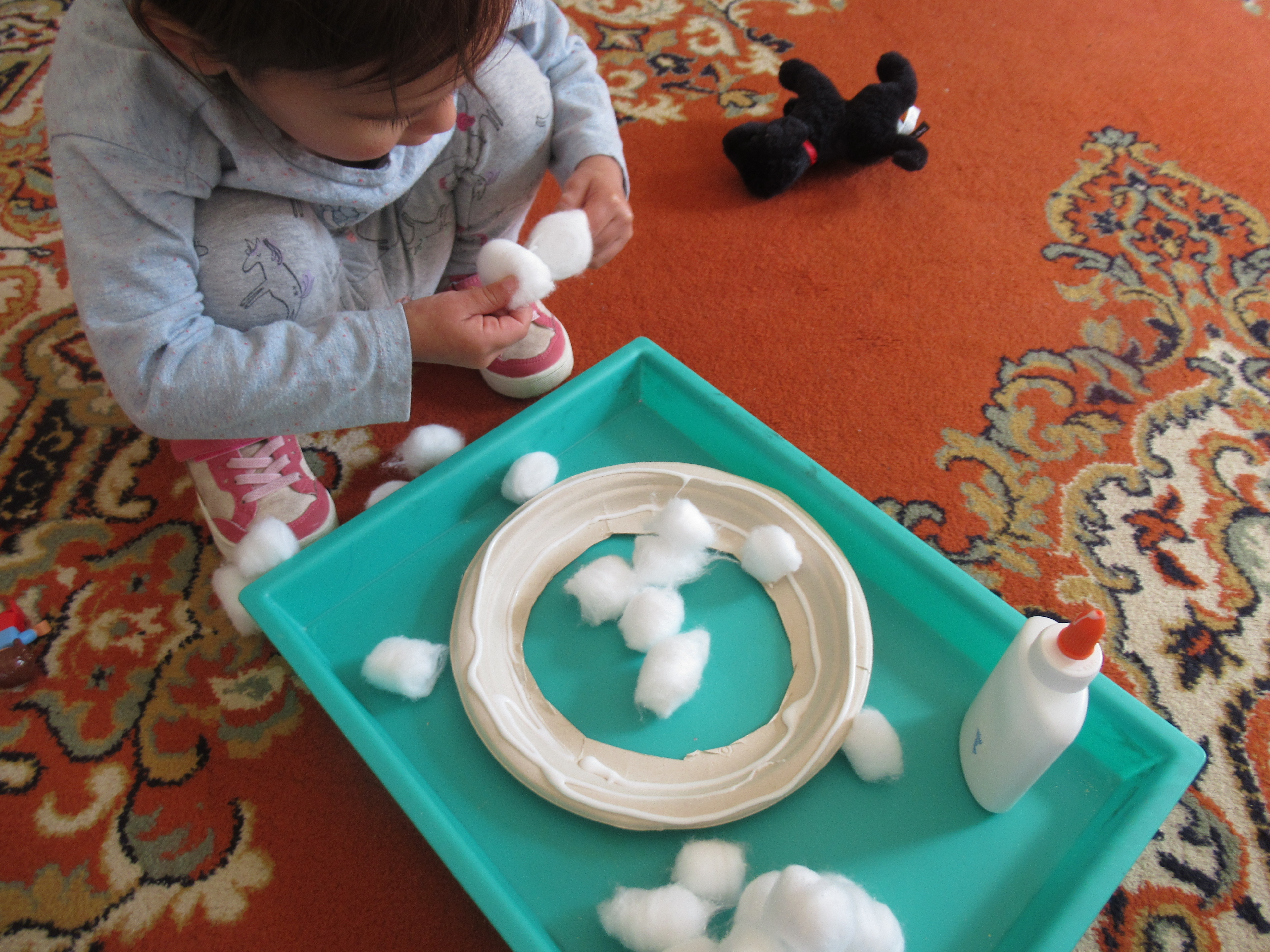 Now, I told her that the sheep was cold and we needed to help him find his wool! I set out a tray of cotton balls, and she immediately got to work. She was so proud that she could help the sheep: “We’re making him so woolly!” she exclaimed.