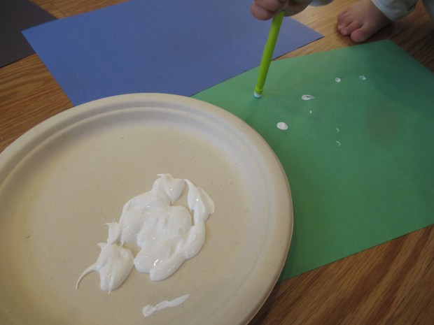 Once or twice she tried to stick a cotton ball on the wall where there was no contact paper and was so surprised when the cotton fell to the floor. This was a very teachable moment, and she realized she needed to stay within the lines of the contact paper.