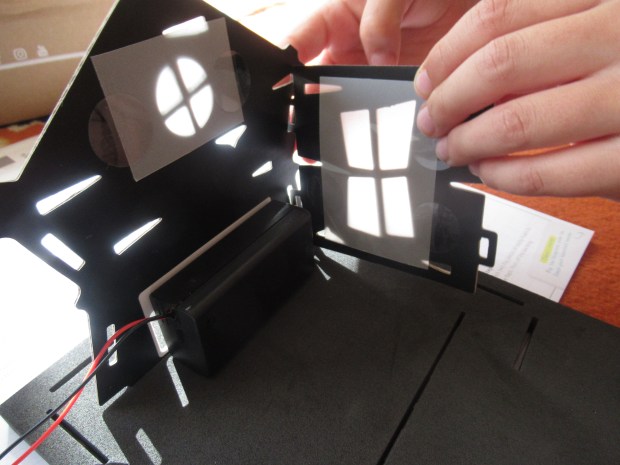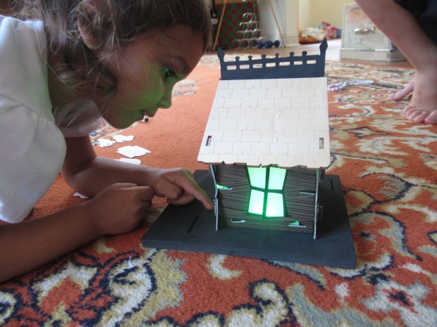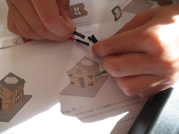 The final experiment didn’t work well for us, but the idea is to slide two provided lightbulb wires through the eye sockets of a tiny wooden pumpkin. Blow up a balloon and rub on your head for static electricity, then hold the balloon near the tips of the lightbulb wires, and the eyes should flicker! We must not have generated much electricity, because we only got a faint spark or two.
