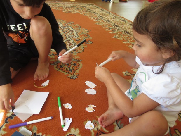Next up, Travis made Dancing Ghosts. He decorated the provided thin paper shapes, which then attach into wooden gravestones and trees with foam dots.