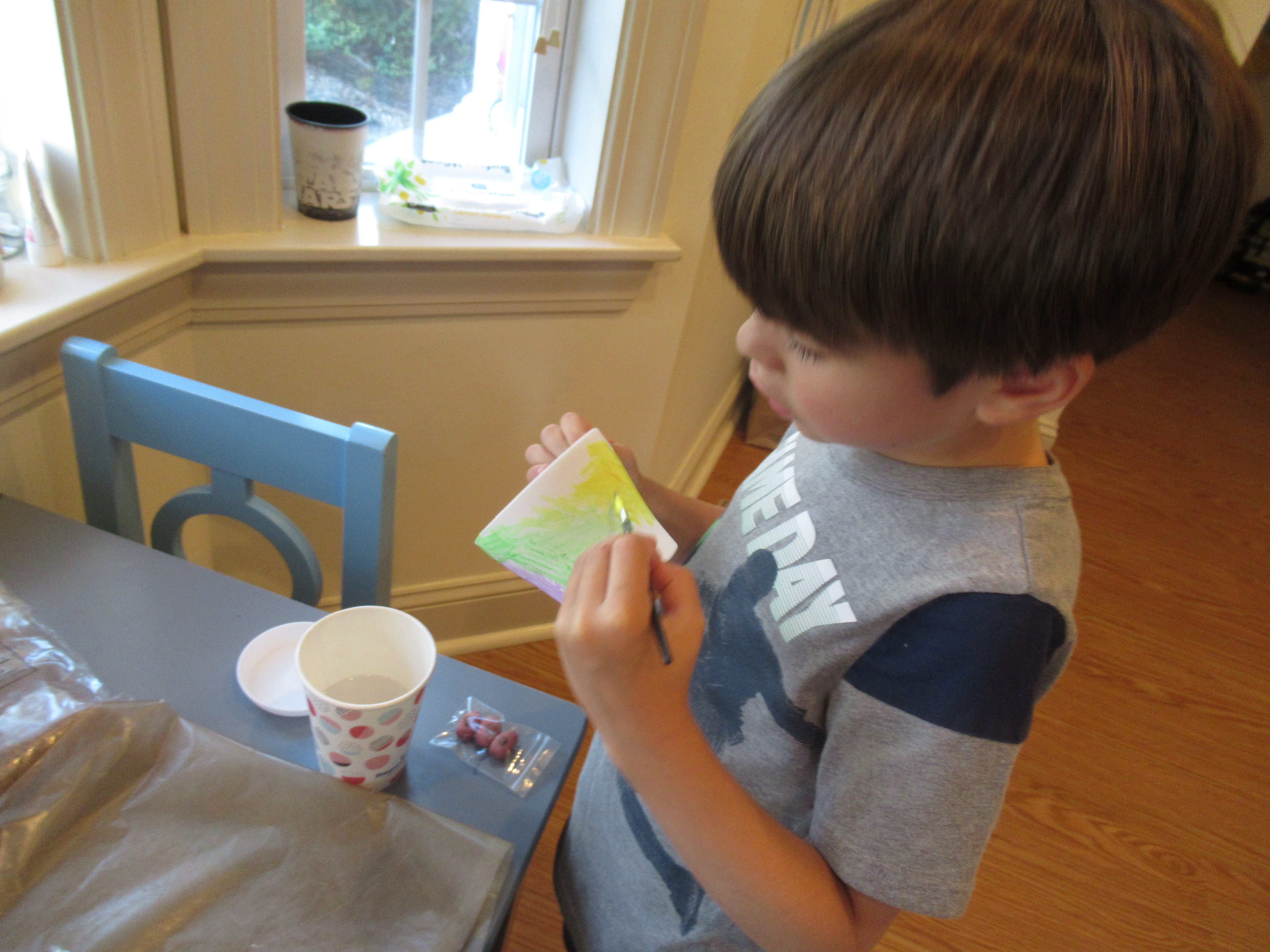 To start, we needed to get crafty. Travis painted the provided white pot with bright paints.
