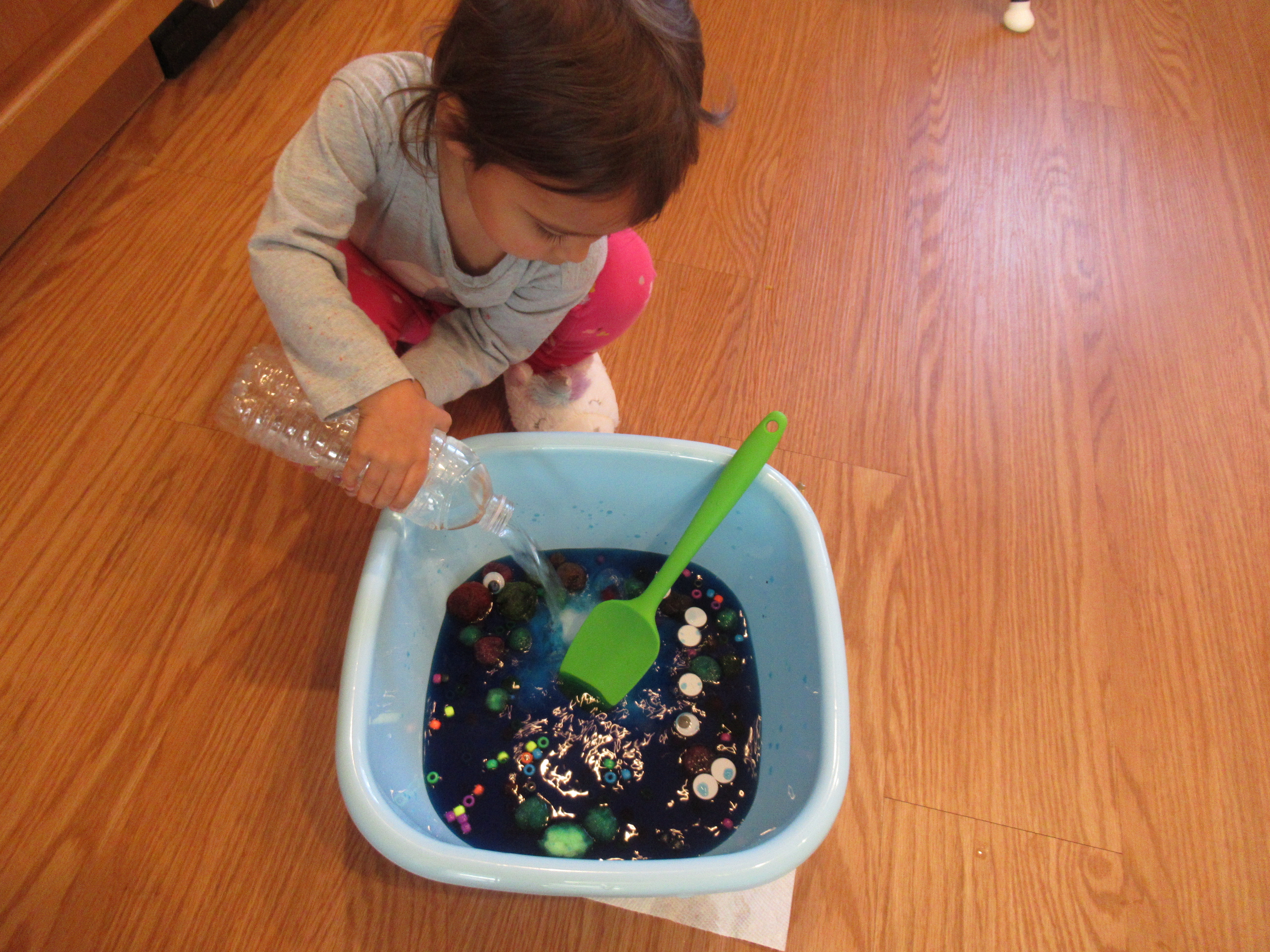 I only put together three bottles: Sunny, Rainy, and Cloudy. But if you want, you can expand and include all 7 from this link (or heck, even more!). We plan to try a sparkly Snowy one with silver glitter or confetti, next time.