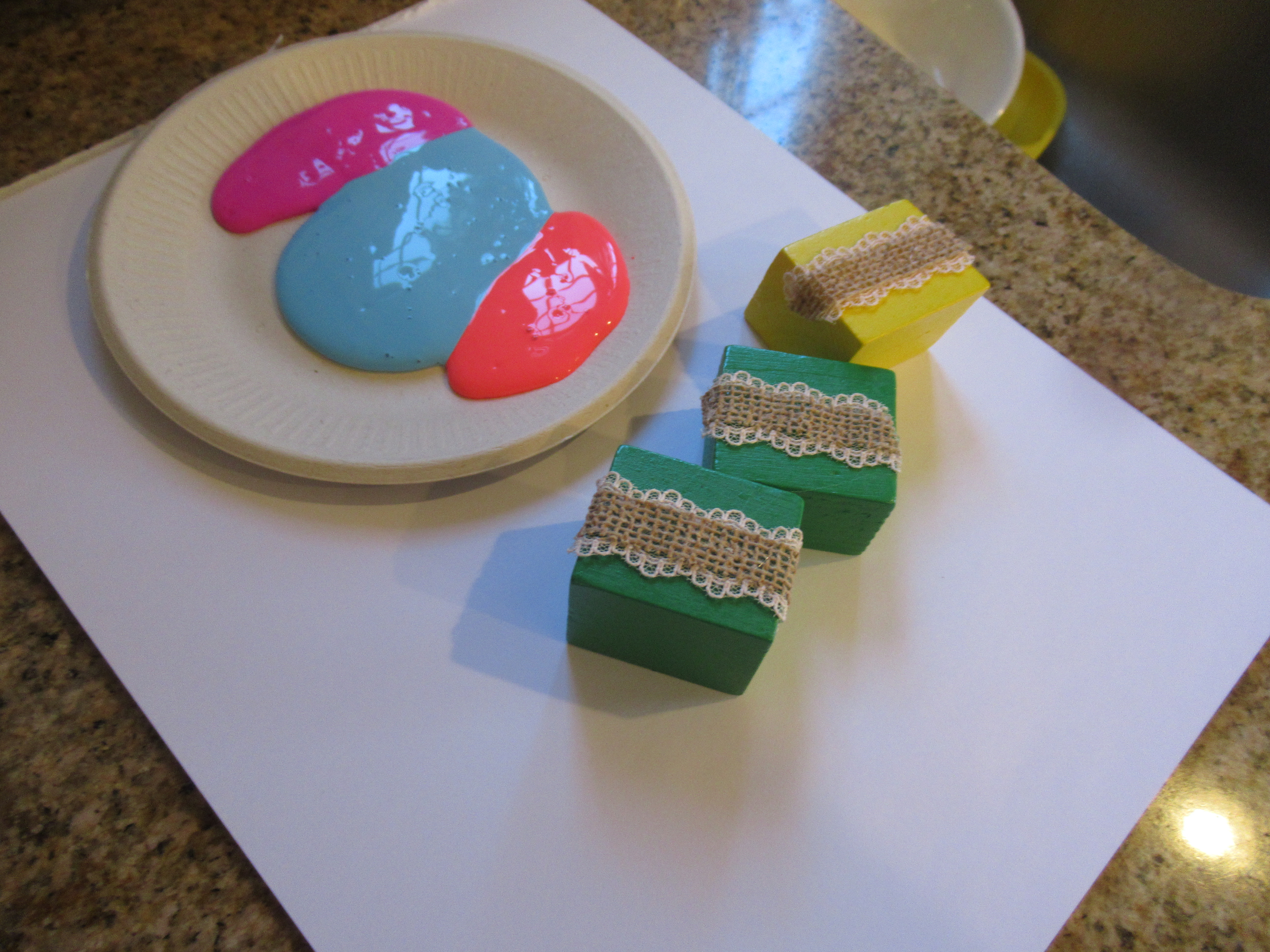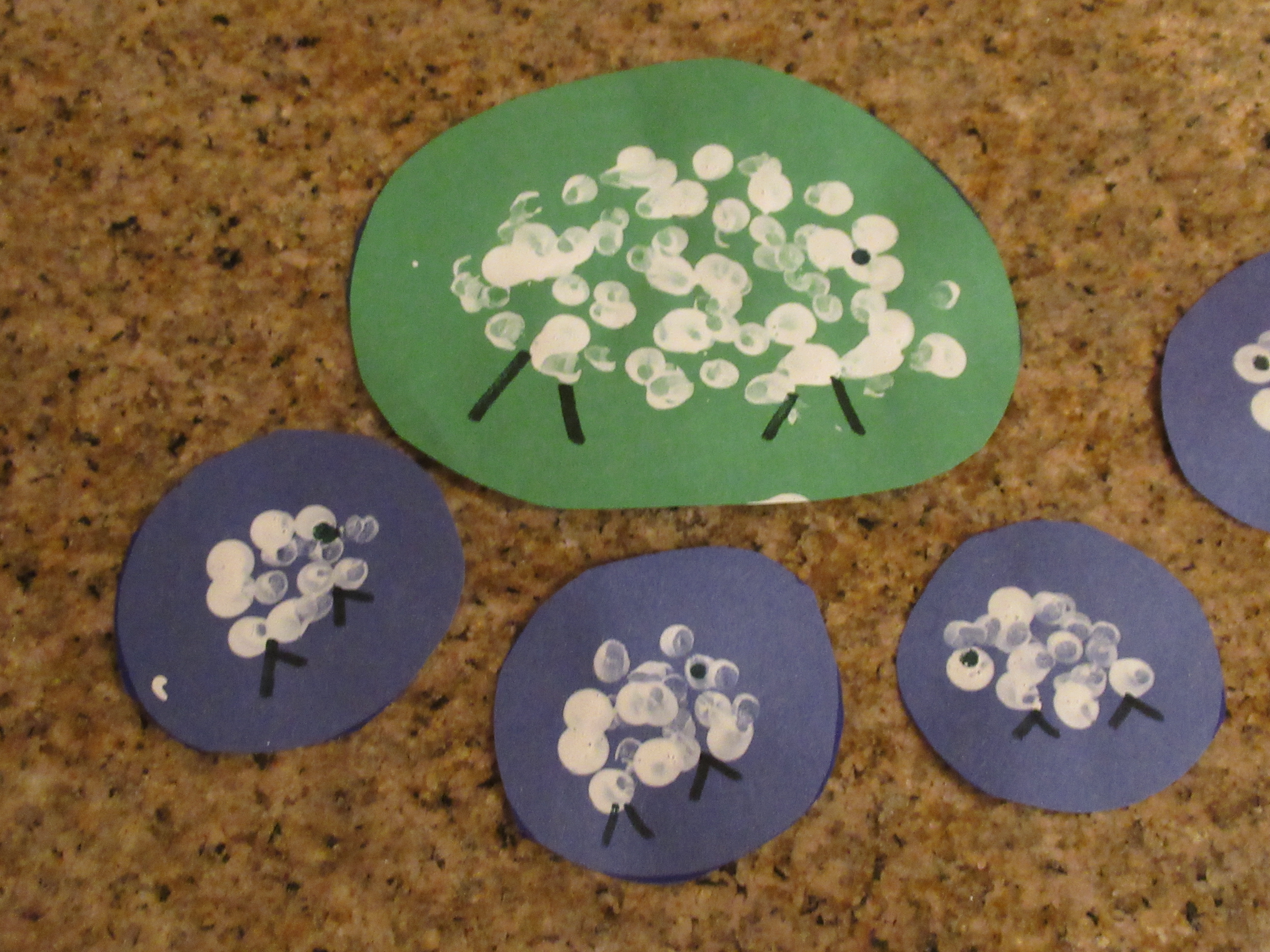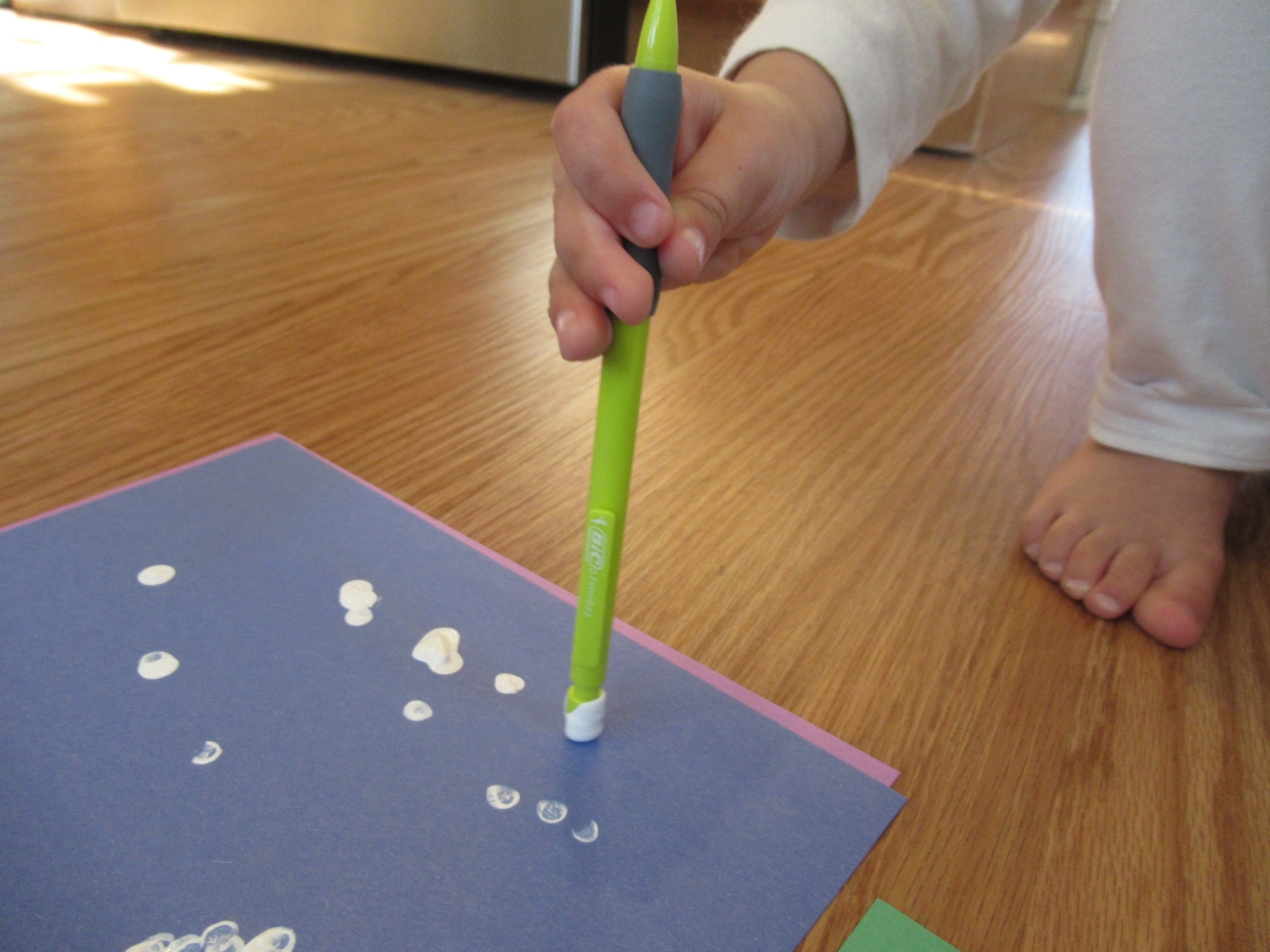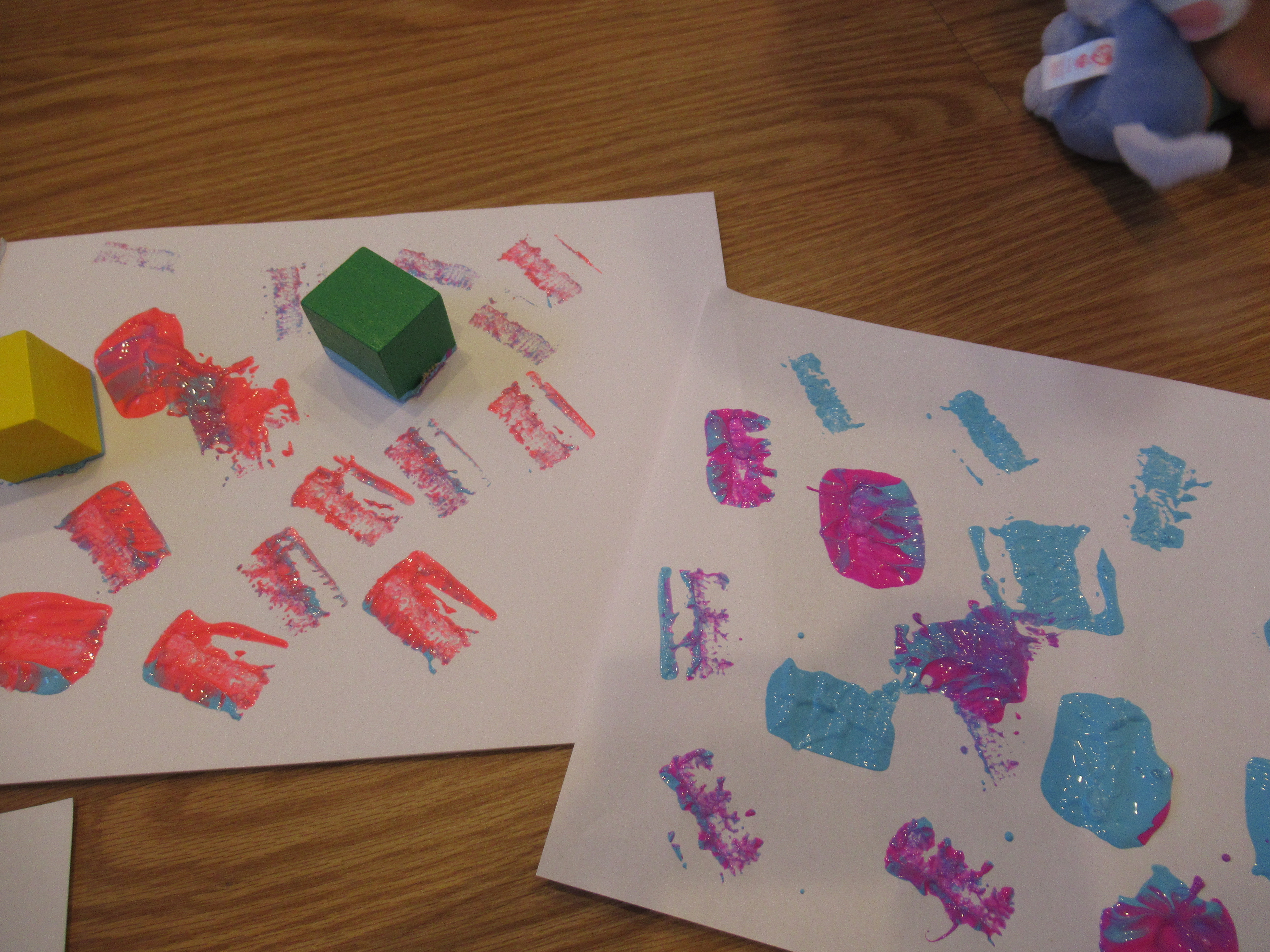 Our paints included dot paints, watercolors, fingerpaints, and regular tempera paint. Our supplies included paintbrushes, craft sticks, sponges, pom poms, a rolling pin… and fingers of course! I simply set all of this out, along with lots of thick white paper.