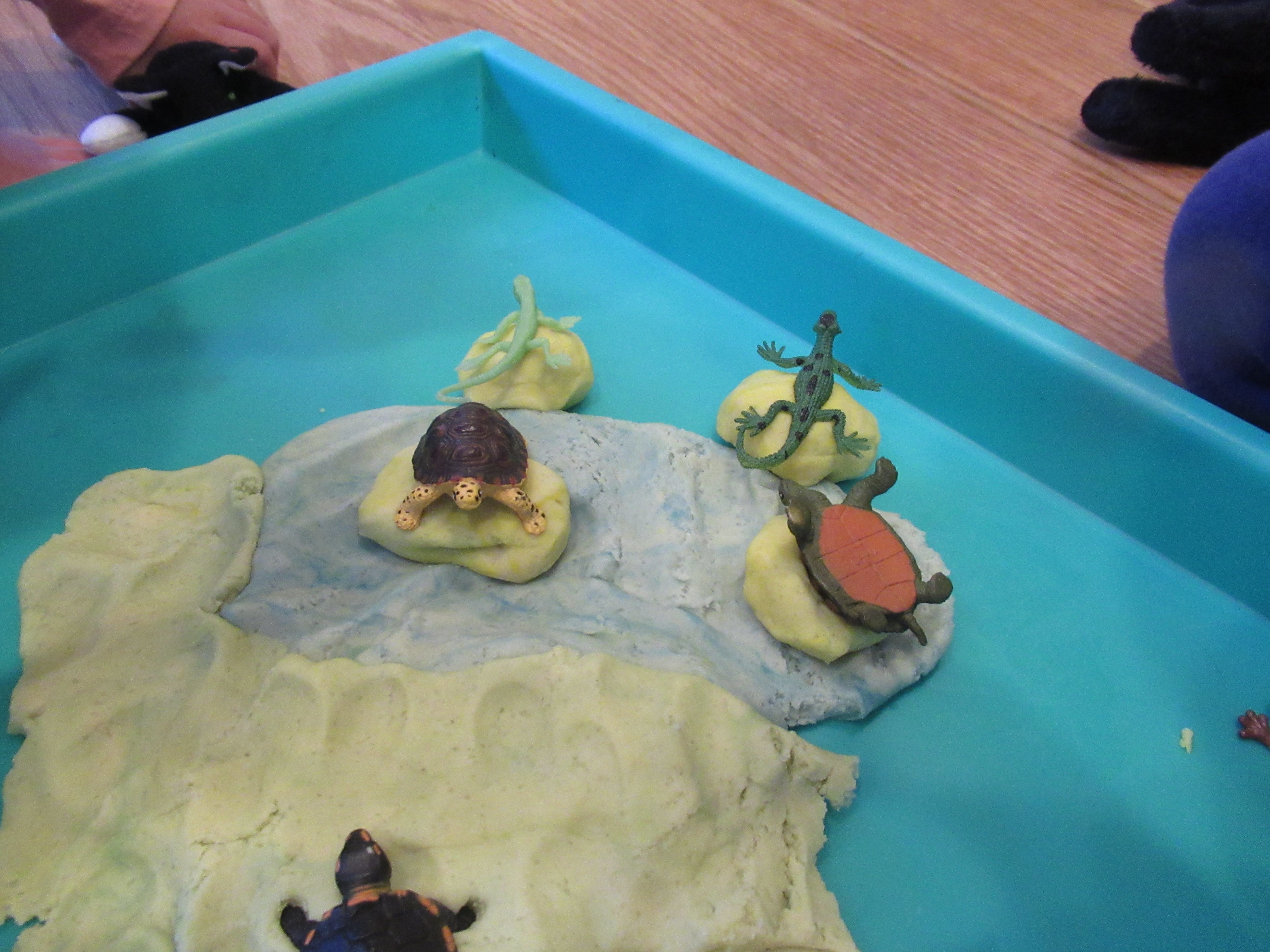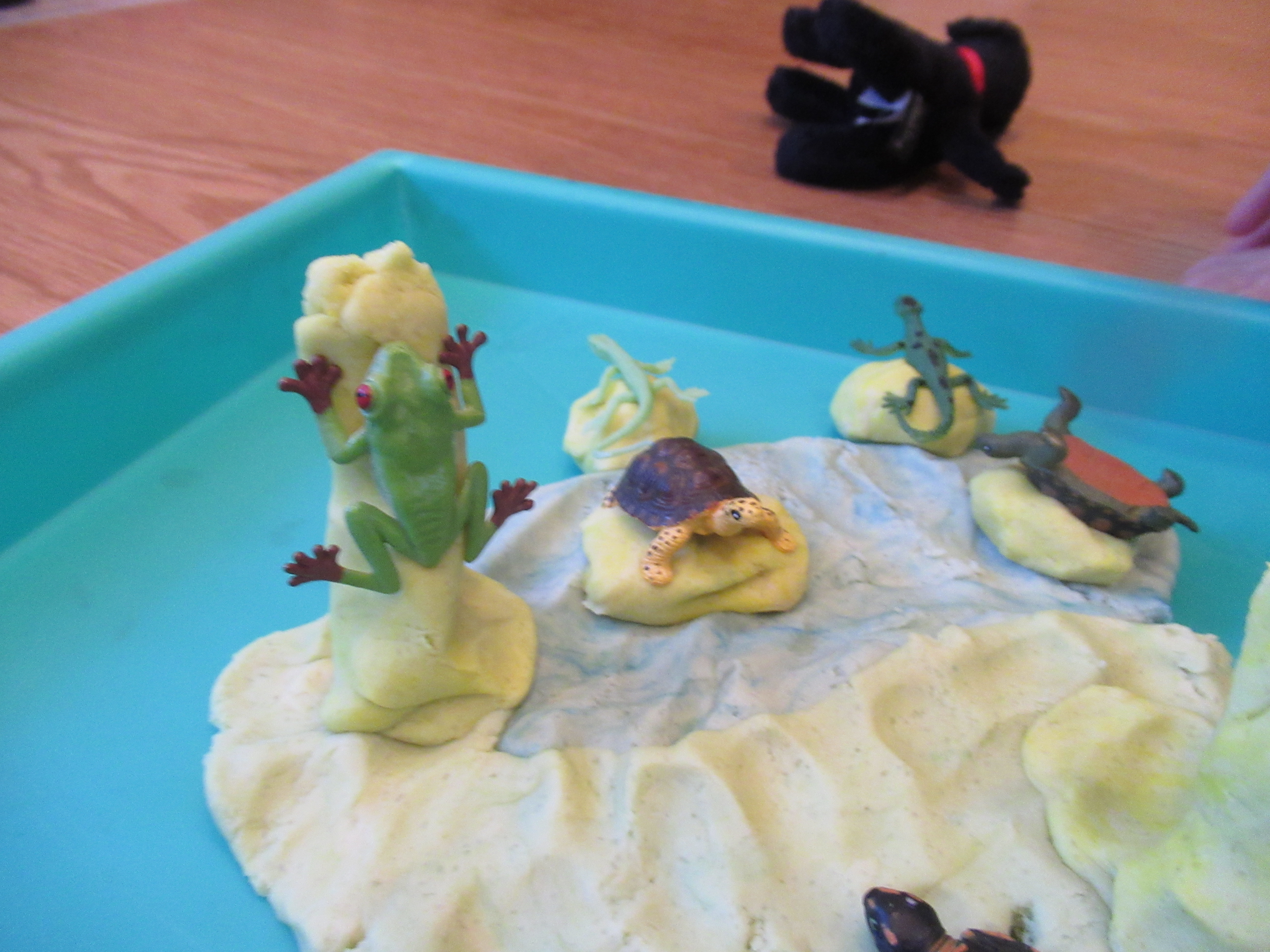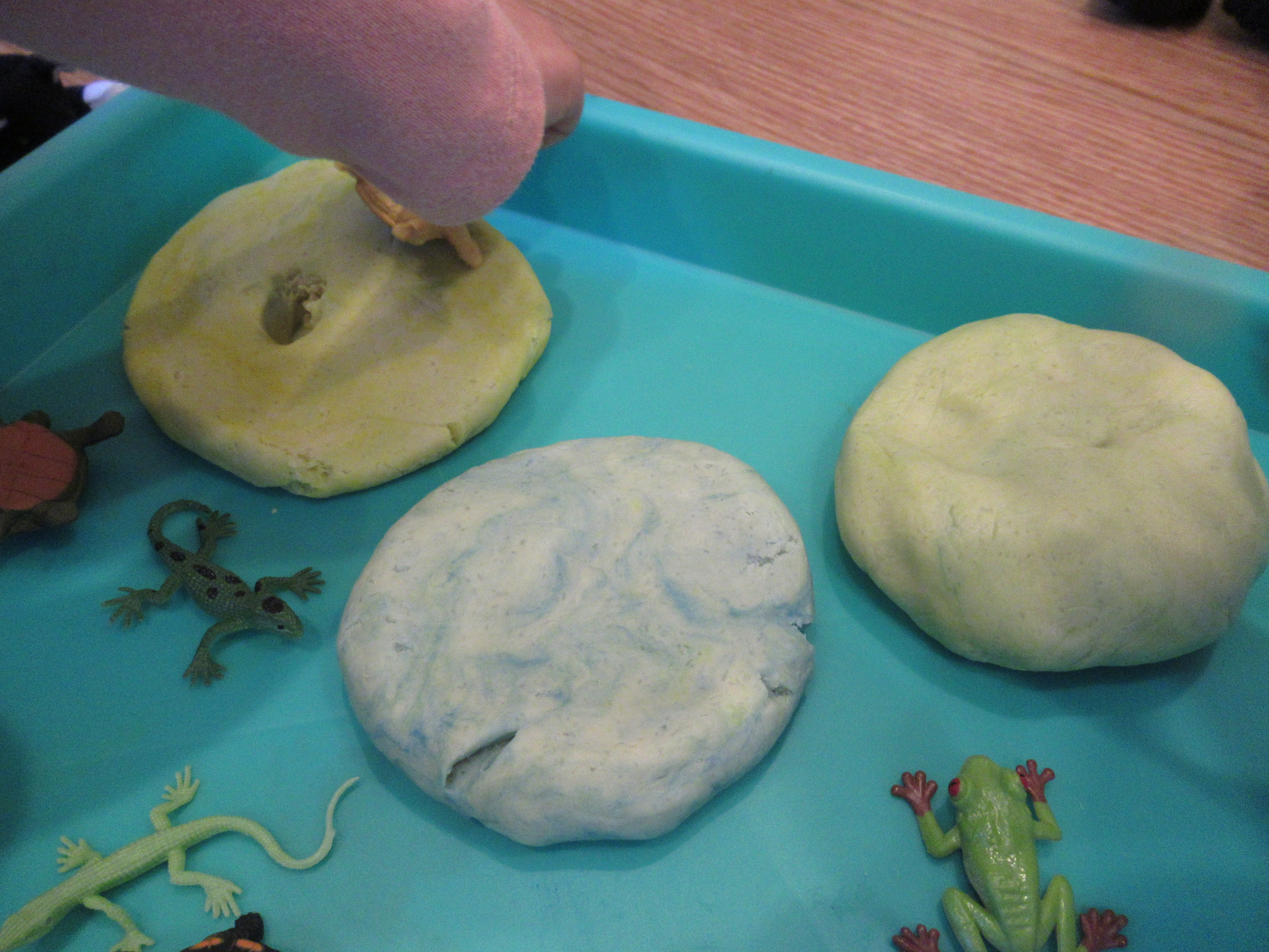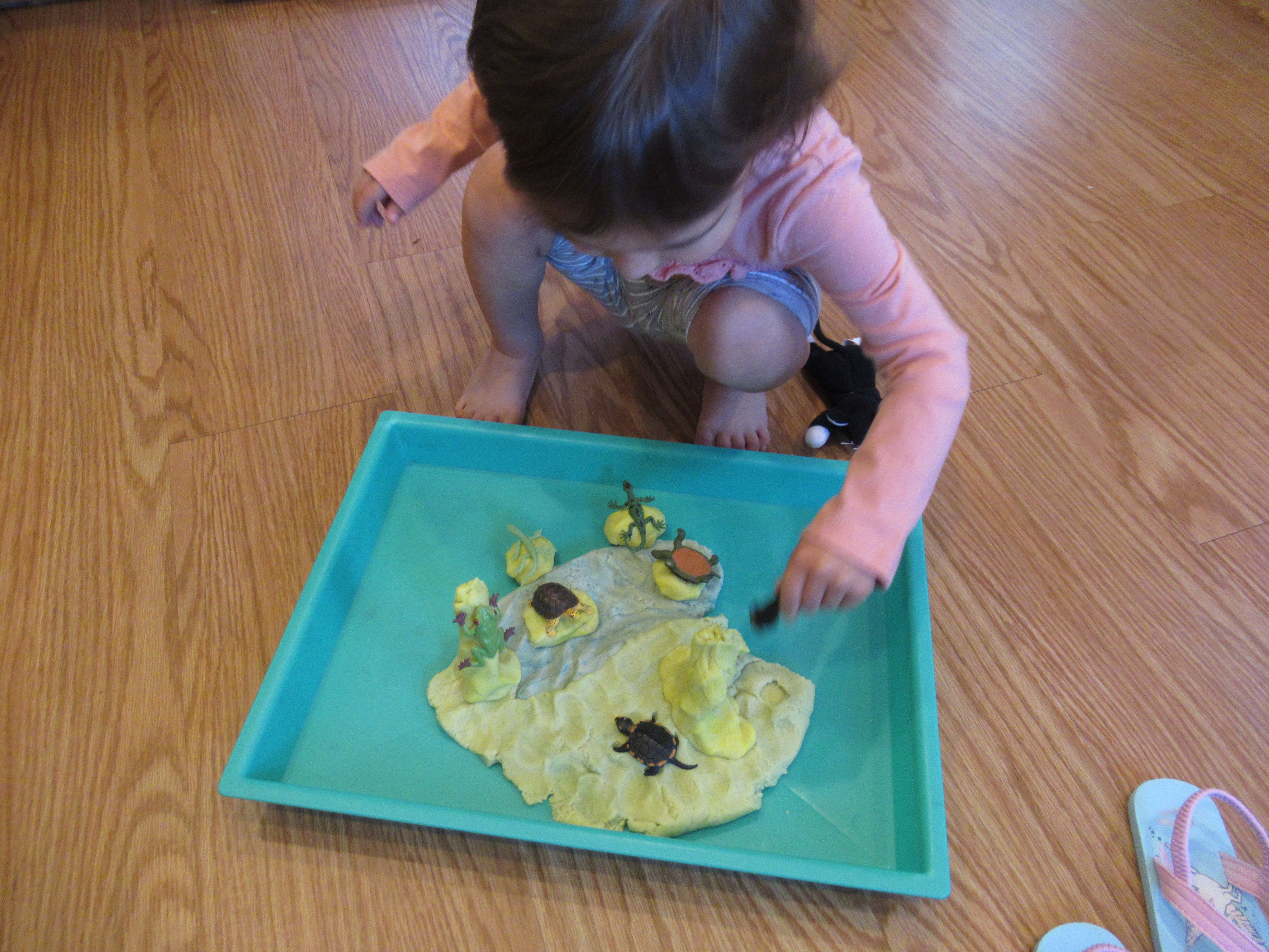 Now our little town just needed cars! Veronika helped shape play dough into long ovals, and then we added “wheels”, which were a variety of juice and soy milk caps I’d been saving up.