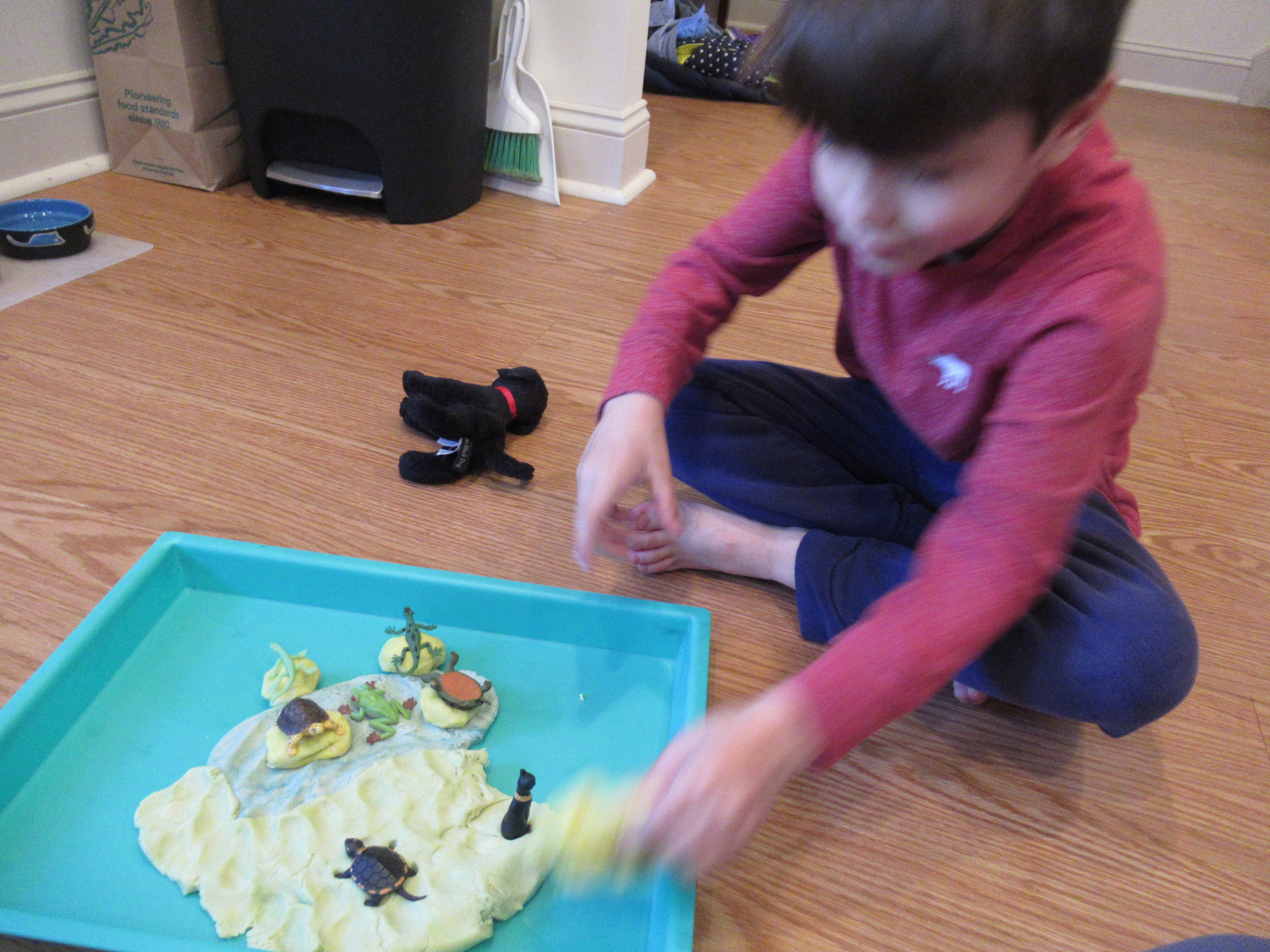 I’d been saving up a variety of household items for a while with this project in mind, all of which meant this morning I could delight Veronika with a full town for her to drive playdough cars through. This project can easily be tailored to multiple ages; older kids can be a part of some or all of the set-up, depending on their age, while the youngest tots will simply enjoy playing in the result!